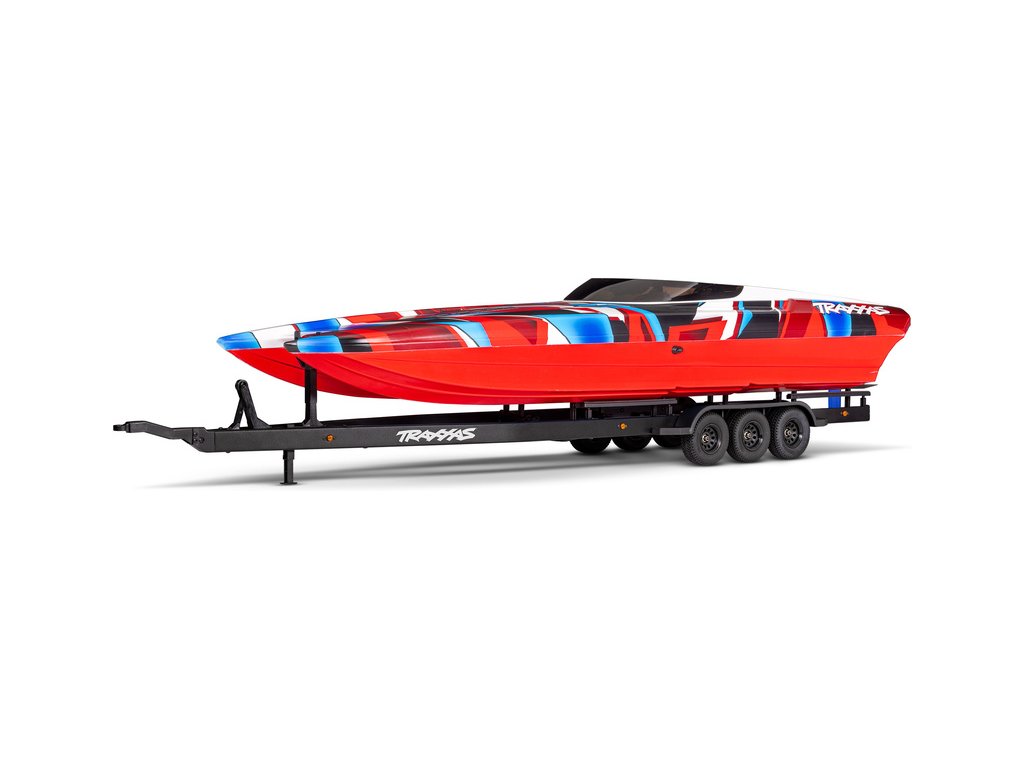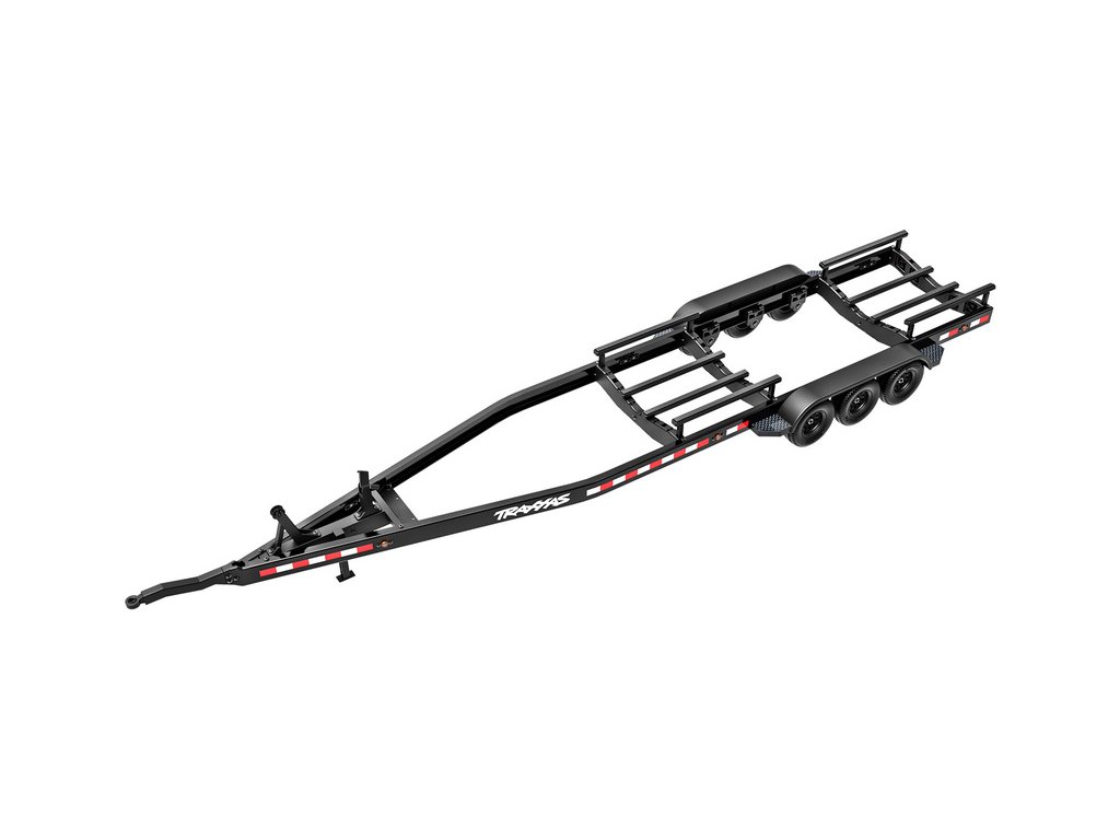 Přepravujte svůj člun Traxxas k vodě stylově s detailním třínápravovým přívěsem. Nastavitelné držáky podpěr na korbě se přizpůsobí klasickému trupu lodi Spartan nebo trupu katamaránu DCB-M41. Elastické úchyty bezpečně připoutají loď k lehkému hliníkovému rámu po celé délce přívěsu. Pomocí obsaženého výškově nastavitelného tažného zařízení můžete přívěs táhnout za RC modely aut Traxxas TRX-4 / TRX-6* (vč. High Trail) a Ford Raptor R. Můžete tak s lodí na přívěsu zacouvat přímo do vody.