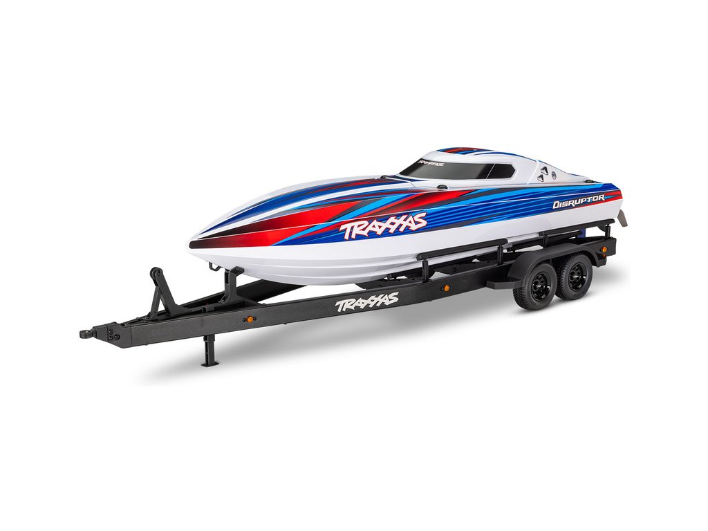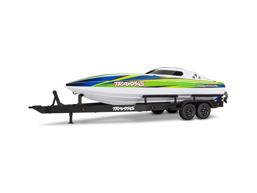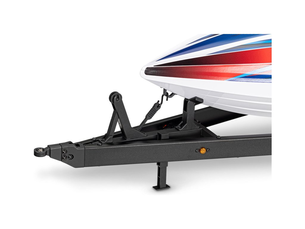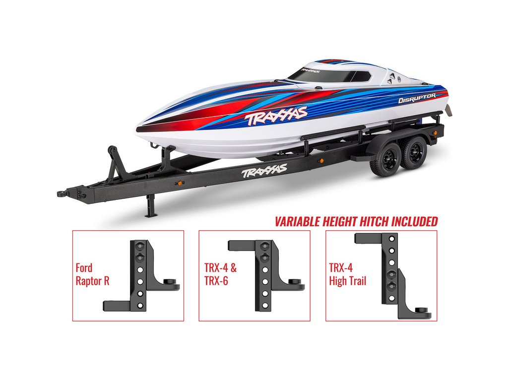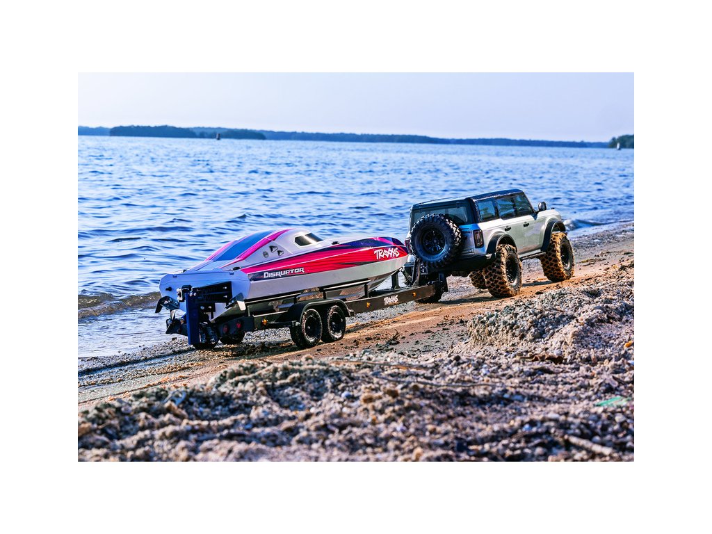 Přepravujte svůj člun Traxxas Disruptor k vodě stylově s detailním dvounápravovým přívěsem. Elastické úchyty bezpečně připoutají loď k lehkému hliníkovému rámu po celé délce přívěsu. Pomocí obsaženého výškově nastavitelného tažného zařízení můžete přívěs táhnout za RC modely aut Traxxas TRX-4 / TRX-6* (vč. High Trail) a Ford Raptor R. Můžete tak s lodí na přívěsu zacouvat přímo do vody.