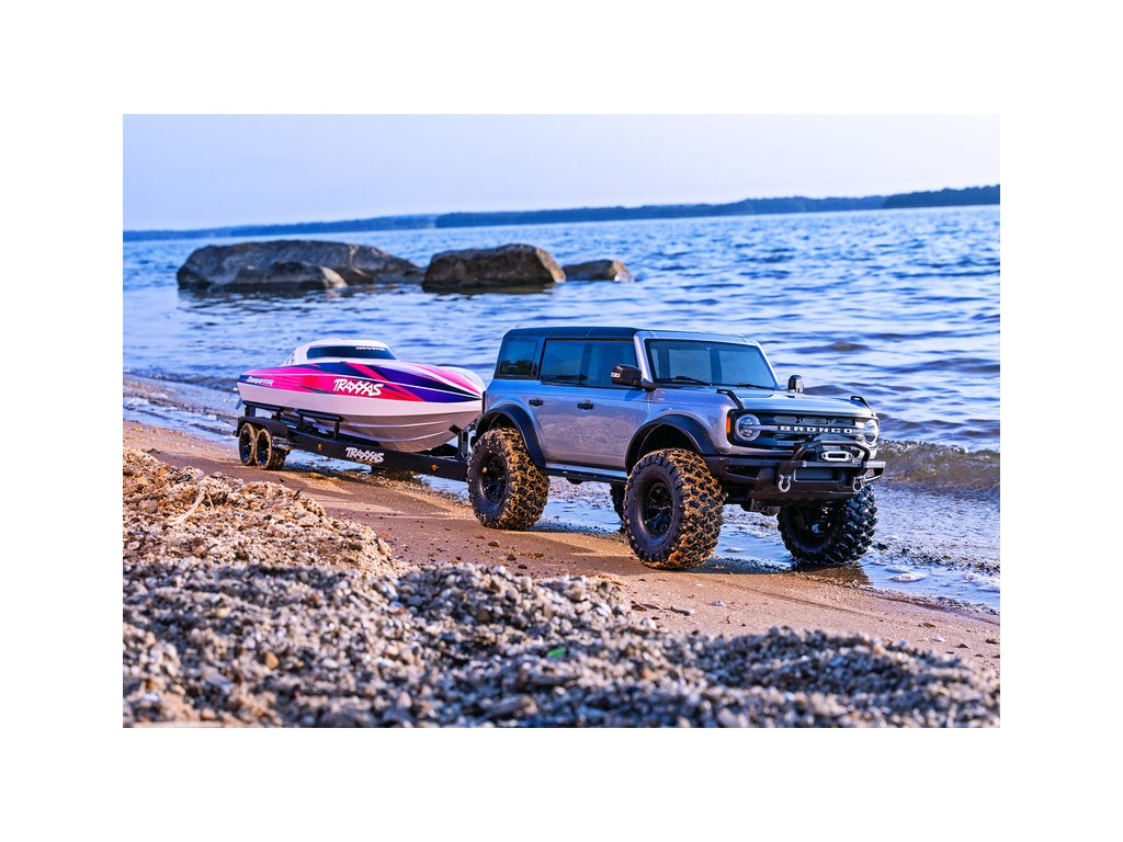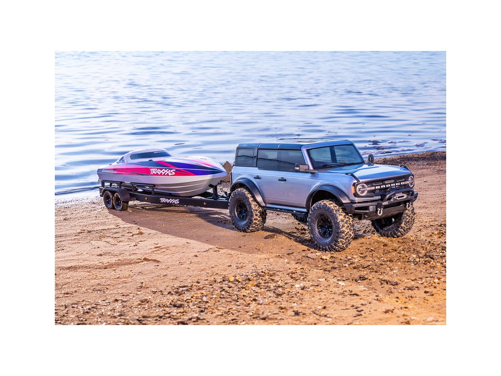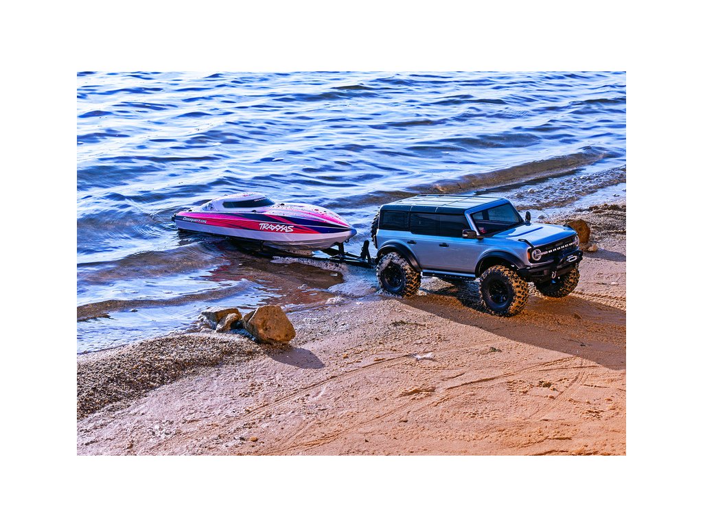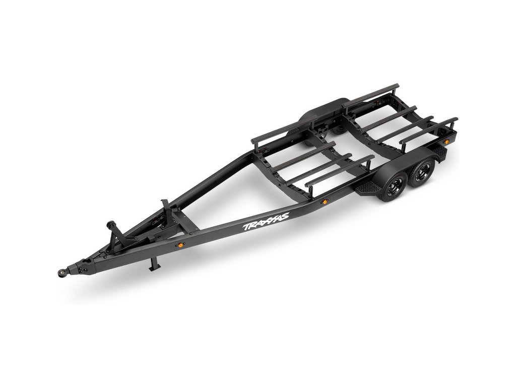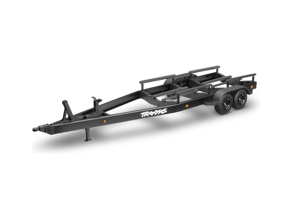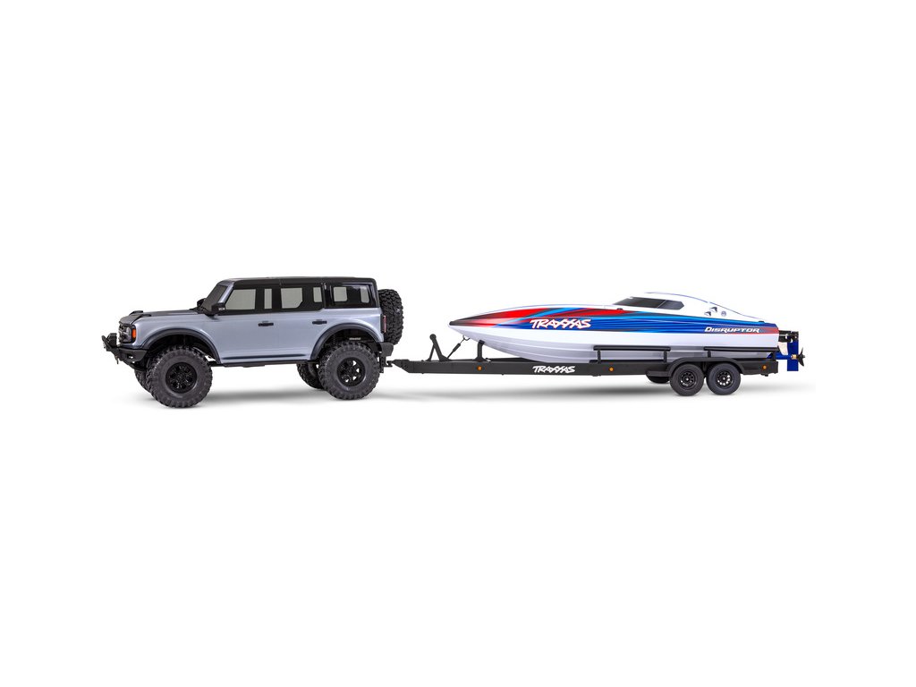 Přepravujte svůj člun Traxxas Disruptor k vodě stylově s detailním dvounápravovým přívěsem. Elastické úchyty bezpečně připoutají loď k lehkému hliníkovému rámu po celé délce přívěsu. Pomocí obsaženého výškově nastavitelného tažného zařízení můžete přívěs táhnout za RC modely aut Traxxas TRX-4 / TRX-6* (vč. High Trail) a Ford Raptor R. Můžete tak s lodí na přívěsu zacouvat přímo do vody.