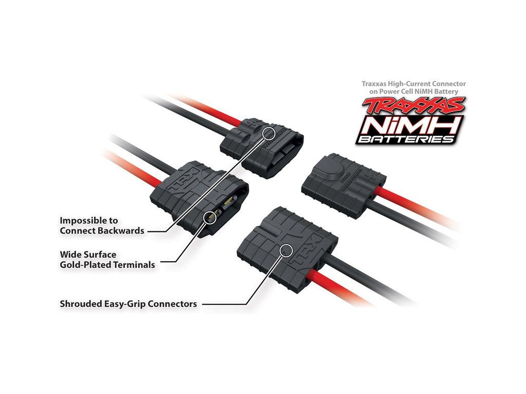 Univerzálními nabíječi Traxxas lze nabíjet akumulátory Traxxas typu LiPo a NiMH. (Nabíječ obsažený v balení je určen jen pro akumulátor typu NiMH, který je součástí balení.) Nabíječe Traxxas představují jednoduchý a bezpečný způsob nabíjení akumulátorů. Společnost Traxxas využívá jedinečný systém iD, díky tomu máte vždy jistotu, že vše jednoduše a bezpečně zapojíte. V konektoru akumulátoru je integrovaný čip, který nabíječ Traxxas automaticky rozpozná a nastaví za Vás všechny parametry nabíjení akumulátoru. Více informací zde.