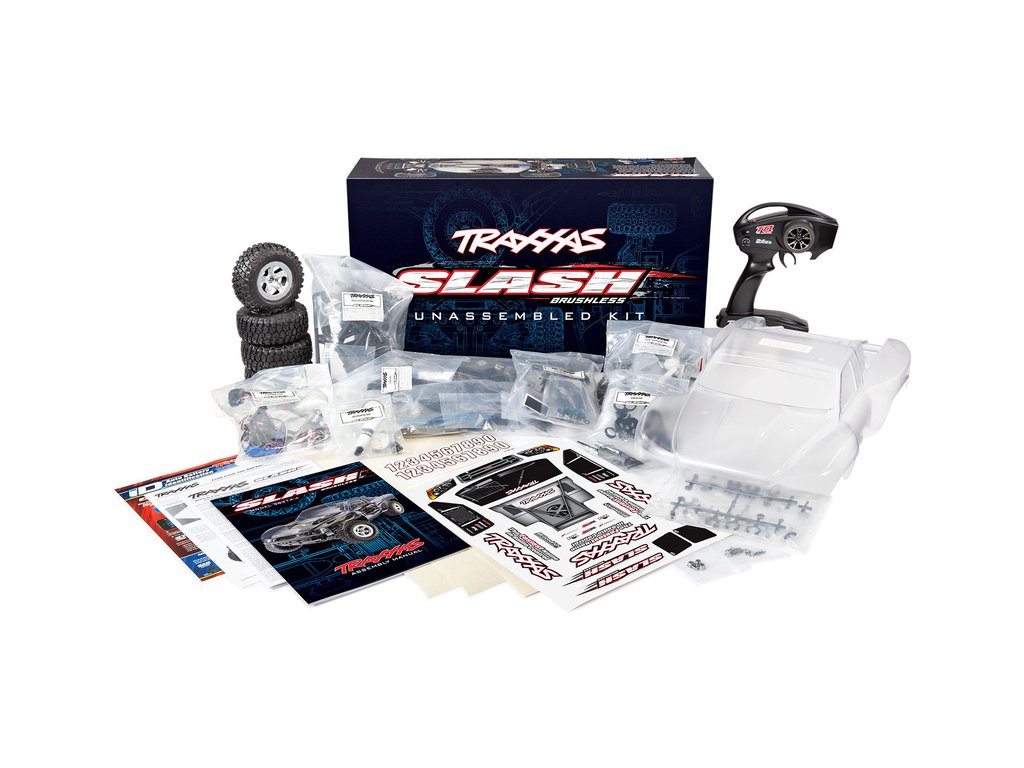 Balení obsahuje díly pro stavbu RC modelu auta Traxas Slash 1:10 BL-2s a elektroniku: střídavý motor 3300ot/V, střídavý regulátor BL-2S, servo Traxxas 2075, přijímač 2.4GHz 3 kan. TQ. Traxxas vysílač 2.4GHz 2 kan. TQ, čirou nenabarvenou karoserii a kola s pneumatikami. Příslušenství: klíč imbus (1.5, 2, 2.5 mm), křížový klíč, klíč na čepy, klíč na spojovačky, klíč antény. Návod CZ a obrázkový manuál pro stavu EN, DE, FR, SP.