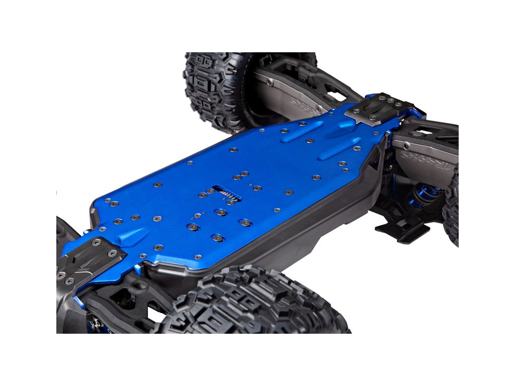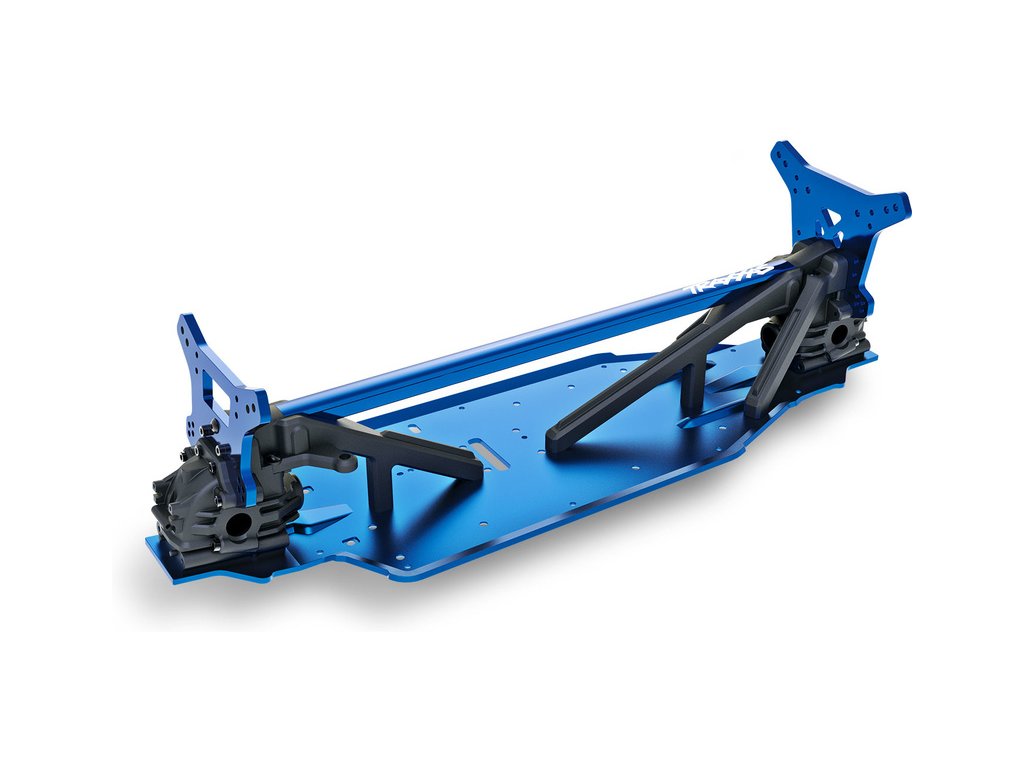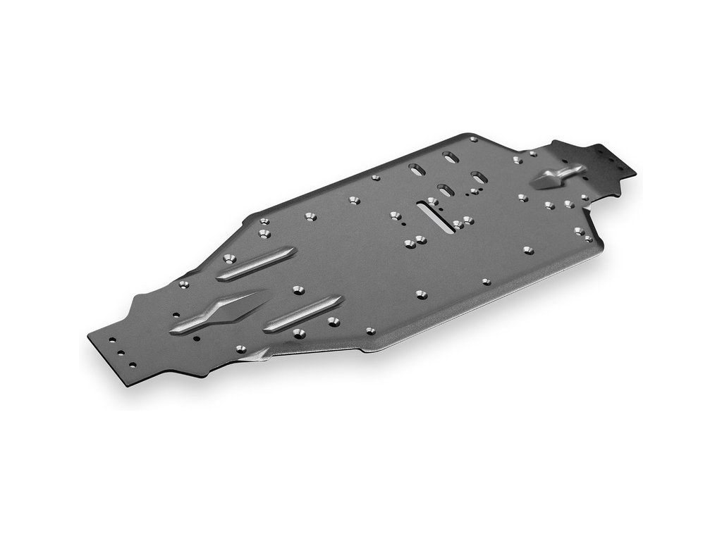 Podvozek RC modelu tvoří lehký a odolný hliníkový plát o tloušťce 3.2 mm. Po celé délce jsou hrany tvarované pro zvýšení pevnosti. Obří přední a zadní příčné výztuhy, připevněné v šesti bodech, poskytují zvýšenou odolnost na nejvíce exponovaných místech při dopadu modelu, což jsou krky podvozku u zavěšení. Pro celkové propojení a vyztužení je použita patentovaná středová výztuha ve tvaru T. Stejně jako podvozek a středová výztuha jsou i věže tlumičů hliníkové s krásným modrým eloxováním.