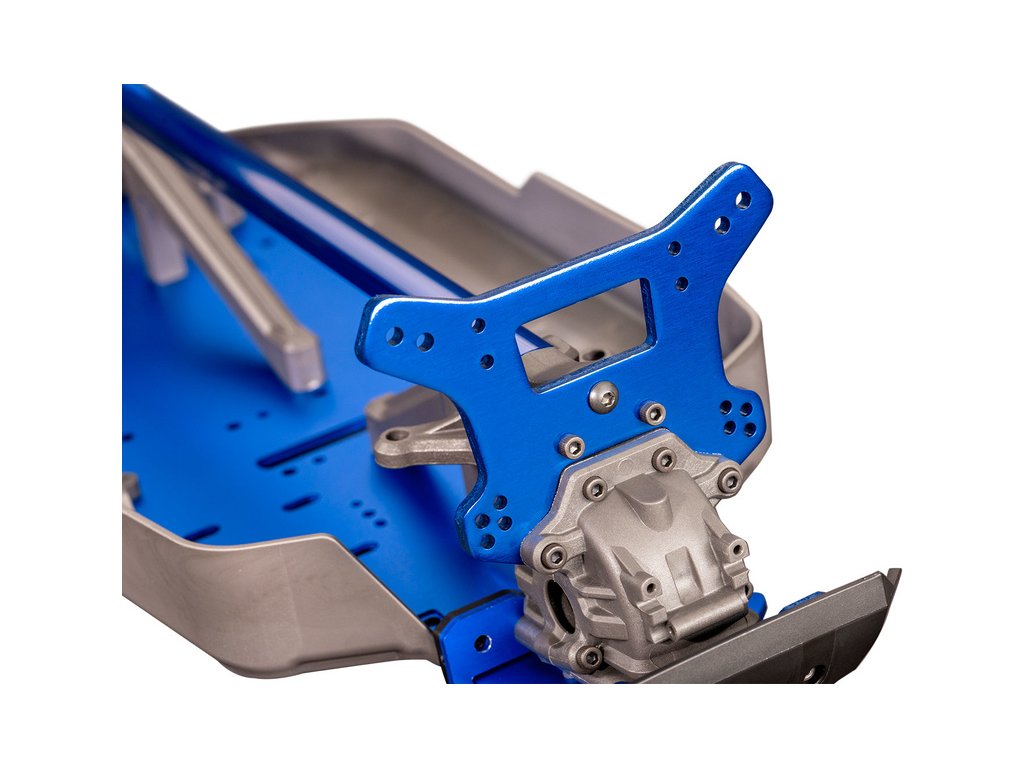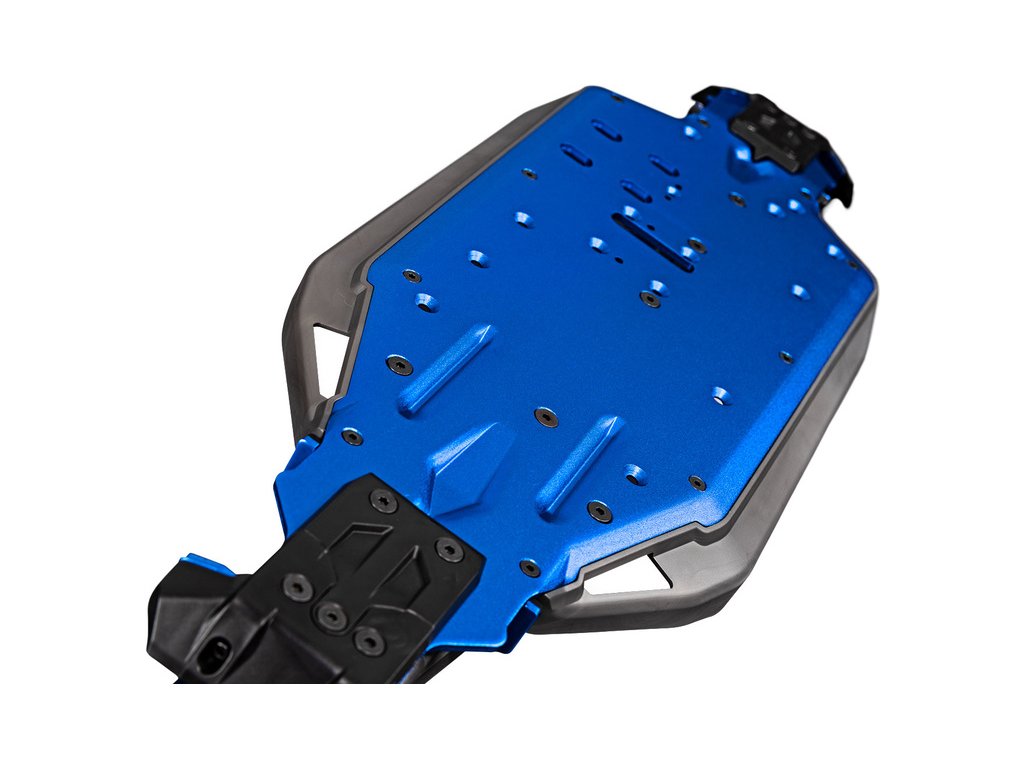 Podvozek RC modelu tvoří lehký a odolný hliníkový plát o tloušťce 3.2 mm. Po celé délce jsou hrany tvarované pro zvýšení pevnosti. Obří přední a zadní příčné výztuhy, připevněné v šesti bodech, poskytují zvýšenou odolnost na nejvíce exponovaných místech při dopadu modelu, což jsou krky podvozku u zavěšení. Pro celkové propojení a vyztužení je použita patentovaná středová výztuha ve tvaru T. Stejně jako podvozek a středová výztuha jsou i věže tlumičů hliníkové s krásným modrým eloxováním.