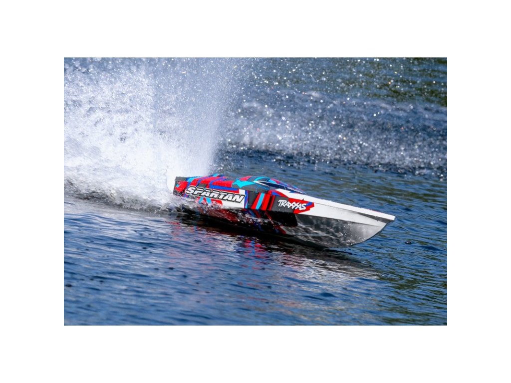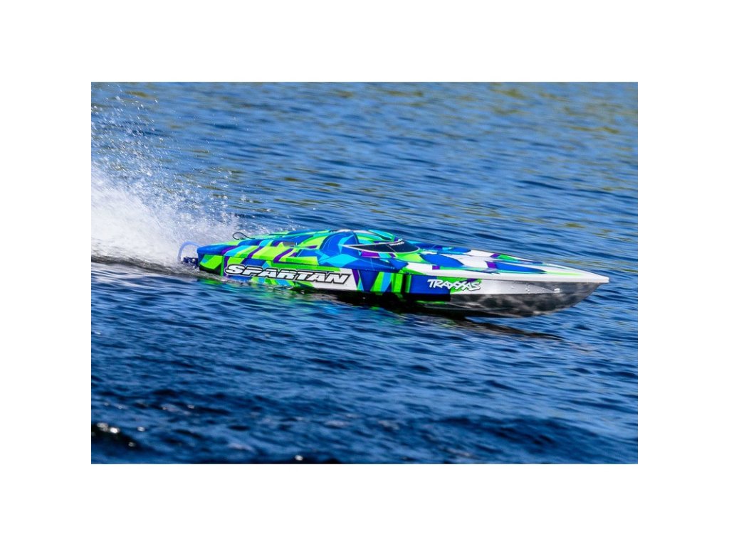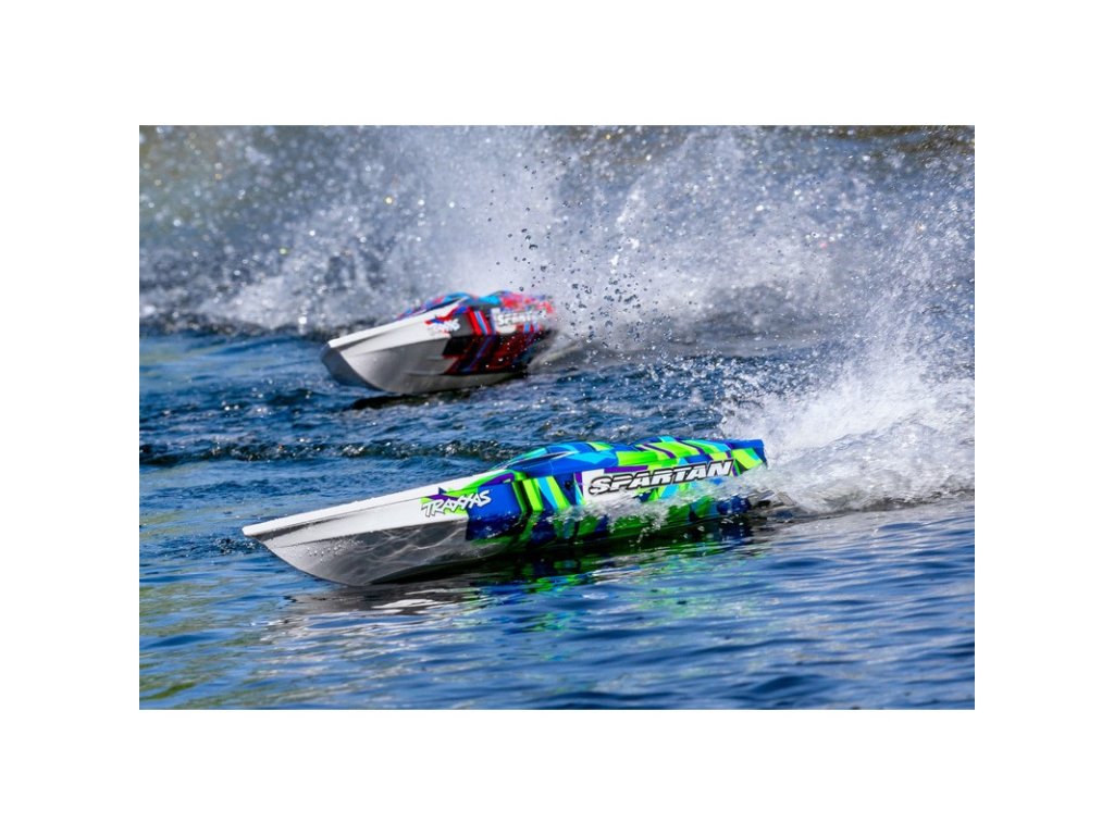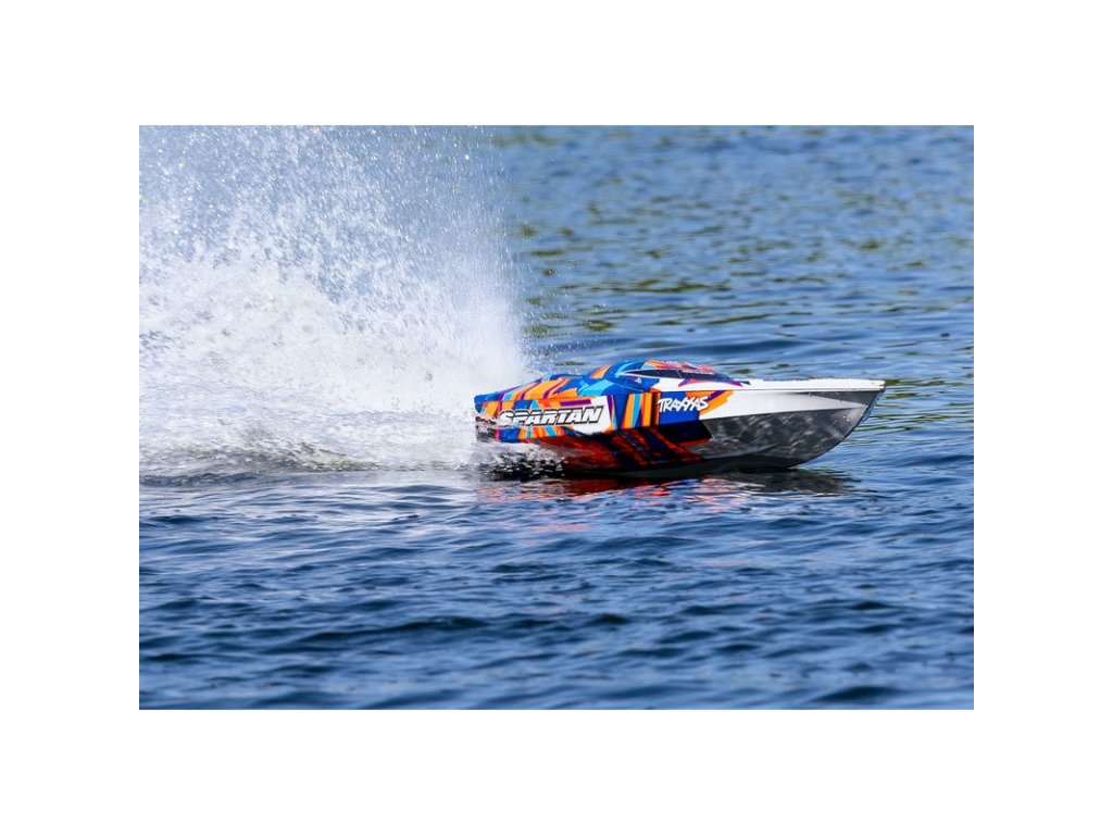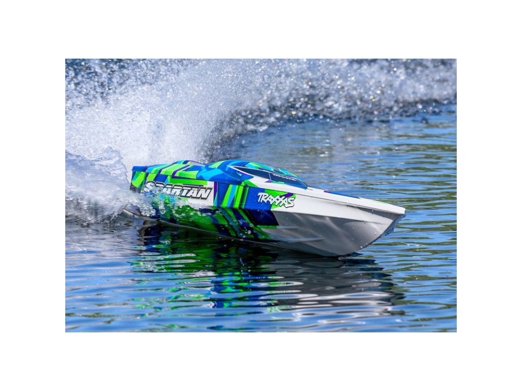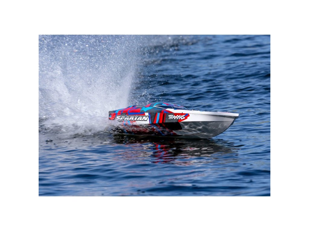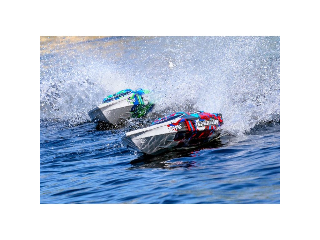 Rychlý člun Traxxas Spartan BL je poháněn střídavým motorem s vodním chlazením, programovatelným regulátorem s reverzem a vodním chlazením kompatibilním s LiPol nebo dvěma 7 čl. bateriemi NiMH. Rychlost přes 80 km/h! Spartan je loď která dělá čest svému výrobci. Čistý, moderní design trupu, integrované přihrádky na baterie pro širokou škálu baterií, výkonné rádio TQi 2,4 GHz s inovativním systémem Traxxas Stability Management (TSM) udržuje Spartan pod úplnou kontrolou. Spartan má sílu, rychlost, pohodlí a hlavně zábavu! Připravte se na konečný výlet RC lodí od Traxxas.