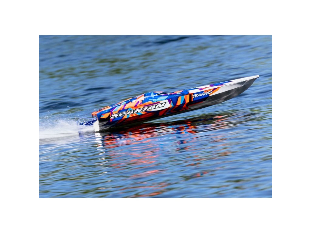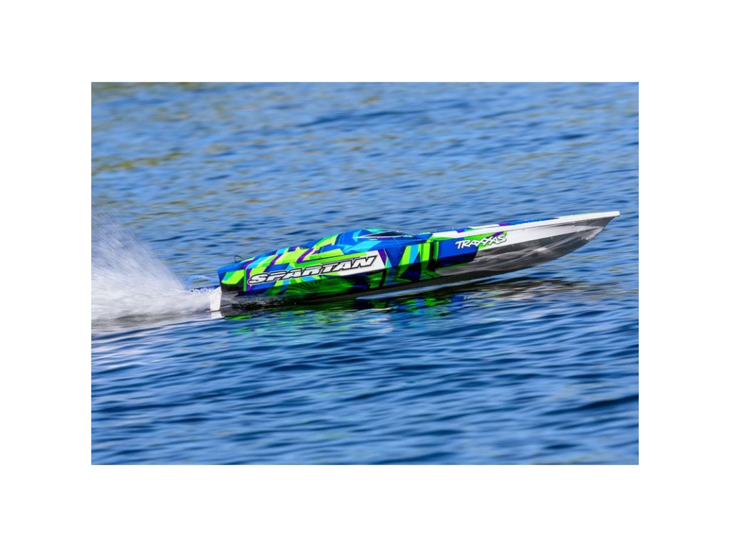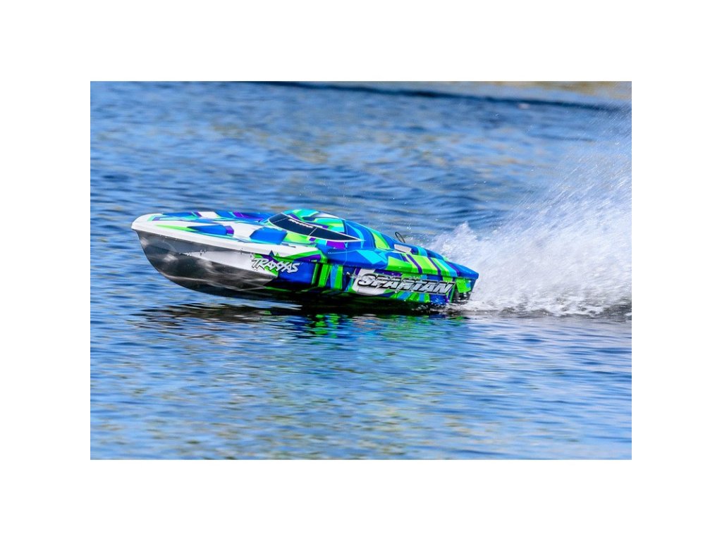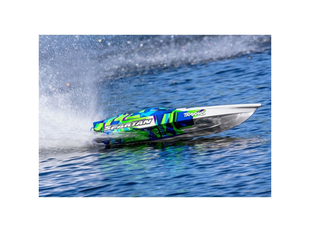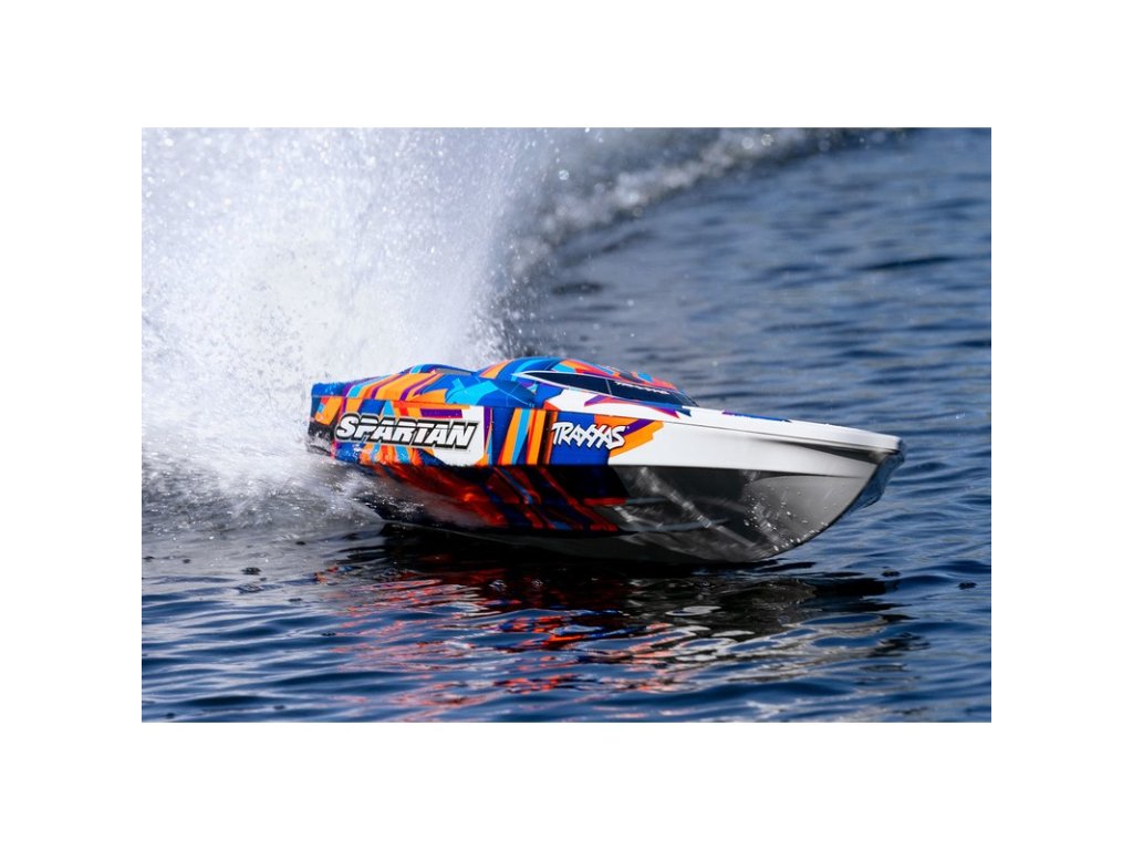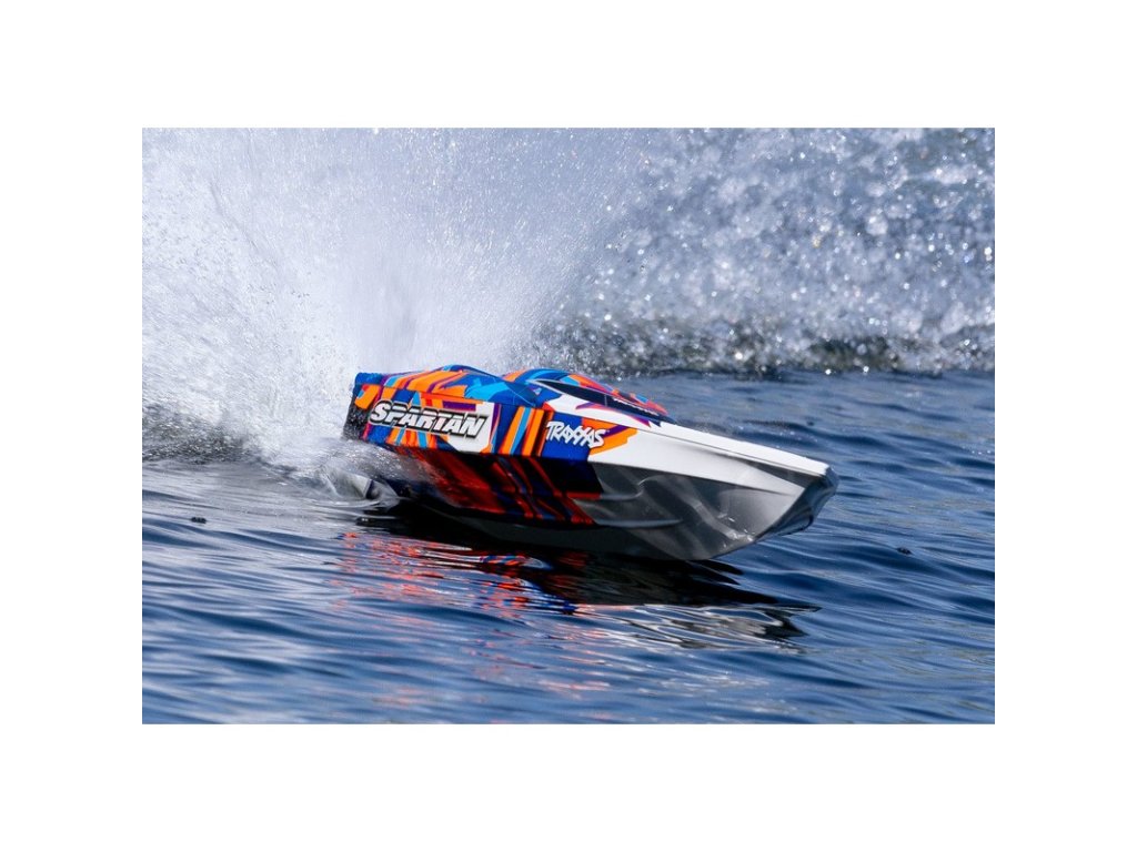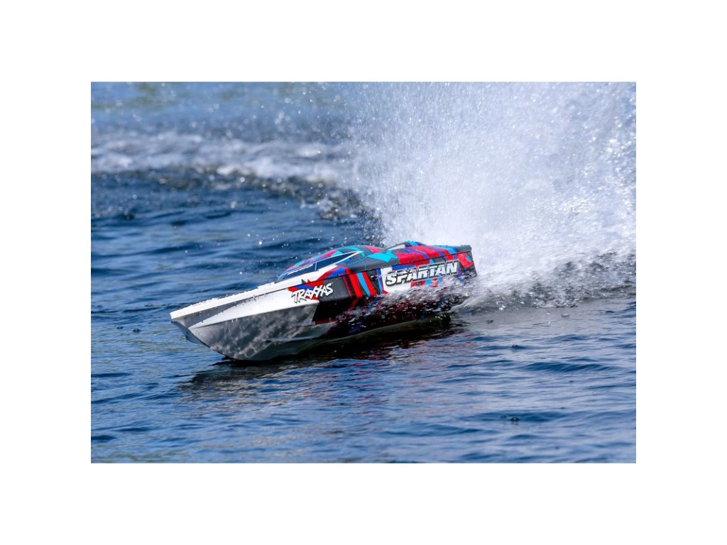 Rychlý člun Traxxas Spartan BL je poháněn střídavým motorem s vodním chlazením, programovatelným regulátorem s reverzem a vodním chlazením kompatibilním s LiPol nebo dvěma 7 čl. bateriemi NiMH. Rychlost přes 80 km/h! Spartan je loď která dělá čest svému výrobci. Čistý, moderní design trupu, integrované přihrádky na baterie pro širokou škálu baterií, výkonné rádio TQi 2,4 GHz s inovativním systémem Traxxas Stability Management (TSM) udržuje Spartan pod úplnou kontrolou. Spartan má sílu, rychlost, pohodlí a hlavně zábavu! Připravte se na konečný výlet RC lodí od Traxxas.