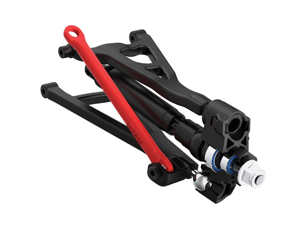 Model využívá jedinečný systém odpružení, kdy jsou tlumiče bezpečně uložené v šasi modelu. Výkyv ramene je na tlumič přenášen pomocí táhla a vahadla.