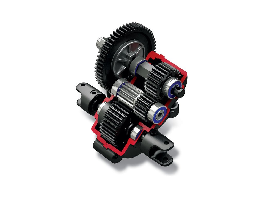 Jedno-rychlostní převodovka na modelu slouží ke zvýšení točivého momentu přenášeného na kola. Součástí převodovky je třecí spojka, která umožní hbitou akceleraci, ale zároveň pohltí ráz motoru, čímž chrání celé pohonné ústrojí modelu.