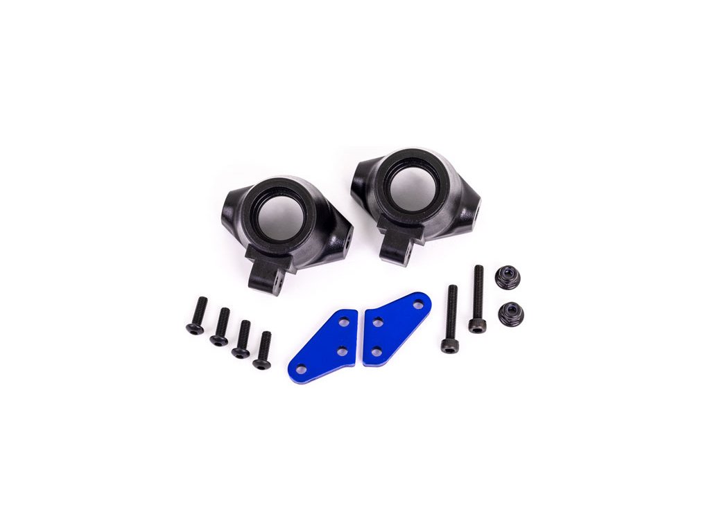 Tunignový díl pro RC model auta Traxxas Sledge. Traxxas těhlice přední hliníková modře eloxovaná (levá a pravá).