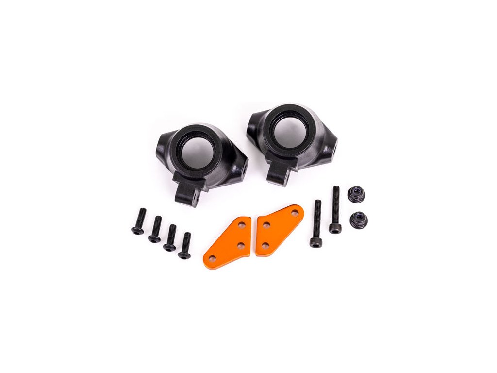 Tunignový díl pro RC model auta Traxxas Sledge. Traxxas těhlice přední hliníková oranžově eloxovaná (levá a pravá).