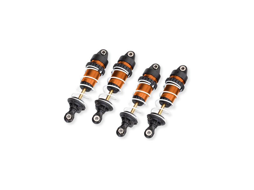 Vysoce kvalitní hliníkové tlumiče GTR Long (dlouhý) - sada 4ks. Sestavené s pružinami. Oranžově eloxované, potažené PTFE pro extra hladký chod a pístnice s TiN - nitridem titanu pro vysokou odolnost a tvrdost povrchu.