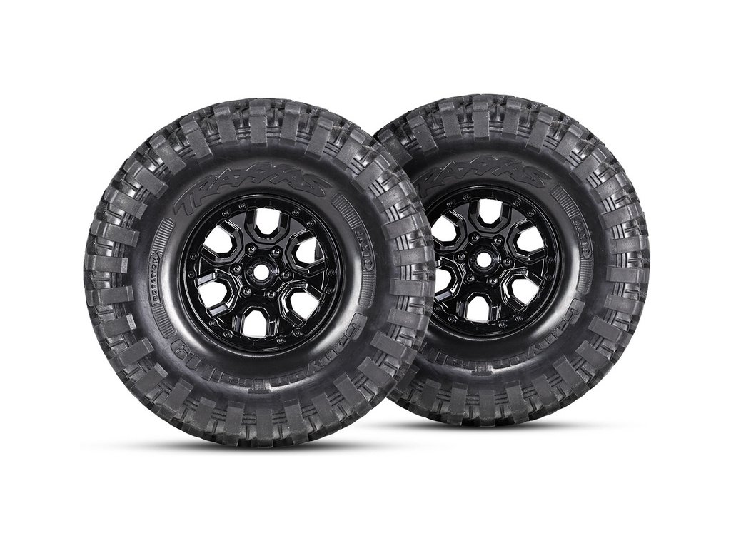 Pneumatiky Canyon Trail 1.9" z extra měkké směsi S1 jsou nalepeny na replice originálních kol Wildtrack. Unašeč kol má 12 mm. RC model auta je rovněž vybaven plně funkčním rezervním kolem.