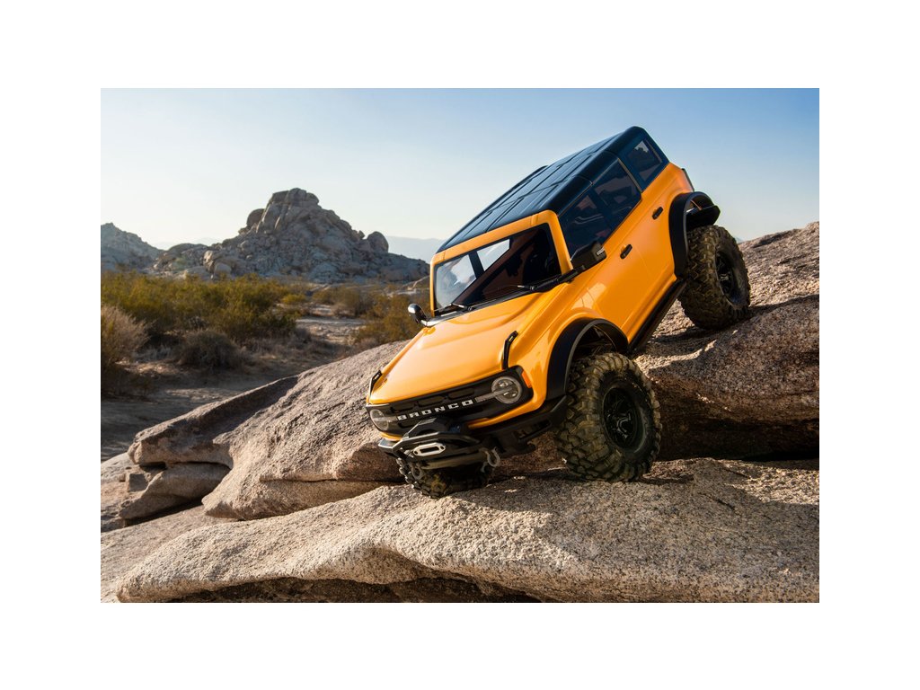Americká legenda je zpět v novém moderním kabátě. Po 25 let se vrátil Ford Bronco jako nejvýkonnější off-road model této značky a jedno z nejvyhledávanější amerických SUV. Traxxas převedl ducha této ikony do svého auta na dálkové ovládání. Na osvědčeném šasi TRX-4 je instalována zcela nová licencovaná karoserie Fordu Bronco 2021. Karoserie je nově bez-sponková. Krásné křivky detailní karoserie s čirými okny, sklopnými zrcátky, stěrači, klikami a rezervním kolem, již neruší sloupky se sponkami. Karoserie je také nachystána na montáž originálního osvětlení Pro Scale (prodává se samostatně), se všemi funkcemi jako reálné auto (funkční směrovky, brzdová světla, zpátečka, různá intenzita světlometů, koncová světla).