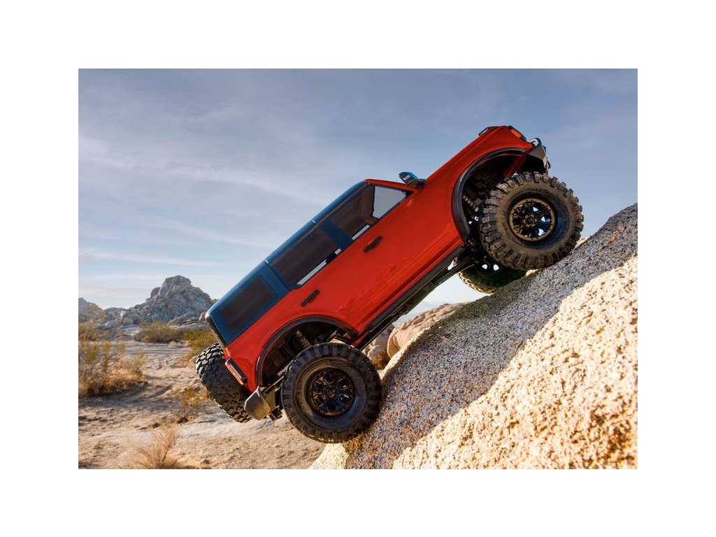 Americká legenda je zpět v novém moderním kabátě. Po 25 let se vrátil Ford Bronco jako nejvýkonnější off-road model této značky a jedno z nejvyhledávanější amerických SUV. Traxxas převedl ducha této ikony do svého auta na dálkové ovládání. Na osvědčeném šasi TRX-4 je instalována zcela nová licencovaná karoserie Fordu Bronco 2021. Karoserie je nově bez-sponková. Krásné křivky detailní karoserie s čirými okny, sklopnými zrcátky, stěrači, klikami a rezervním kolem, již neruší sloupky se sponkami. Karoserie je také nachystána na montáž originálního osvětlení Pro Scale (prodává se samostatně), se všemi funkcemi jako reálné auto (funkční směrovky, brzdová světla, zpátečka, různá intenzita světlometů, koncová světla).