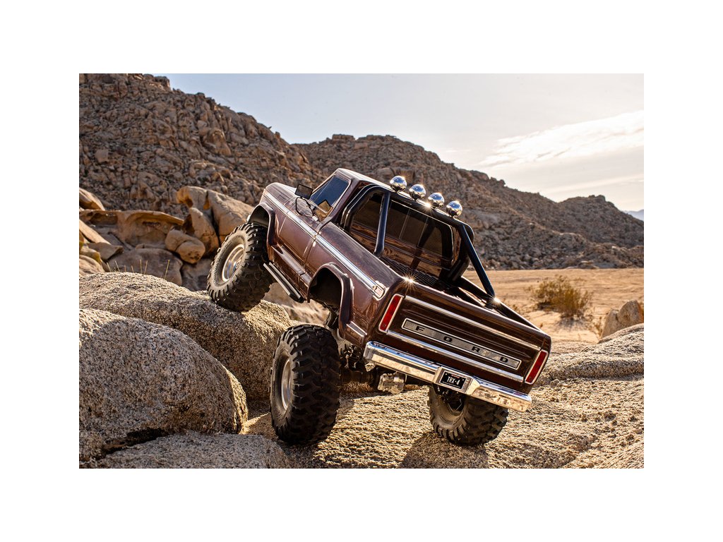 Expediční RC model auta TRX-4 Ford F-150 Ranger XLT 1979 s vyšší světlou výškou, většími 2.2" koly, delším rozvorem a detailní bez-sponkovou karoserií. Chromované prvky, rám korby, portálové nápravy, dálkově řízená převodovka a uzávěrky diferenciálů.