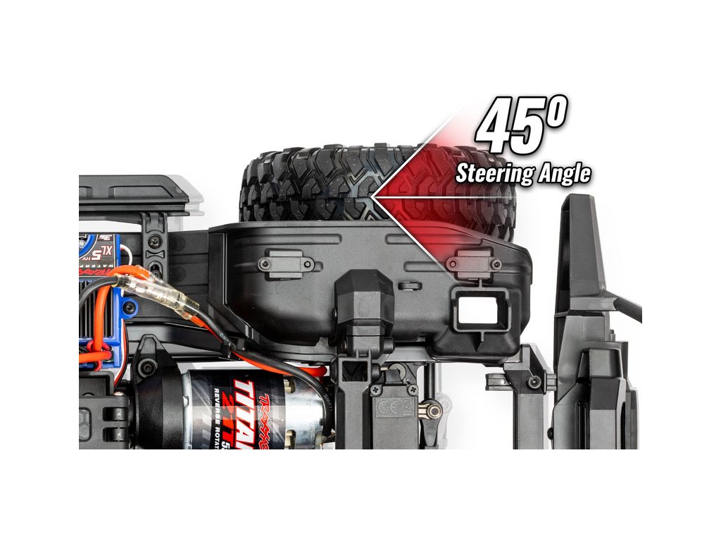 Zatáčení předních kol je možné o úhel 45°, řízení je zajištěno servem Traxxas 2075X s kovovými převody. Díky novému šasi dosáhl model skvělého nájezdového úhlu.