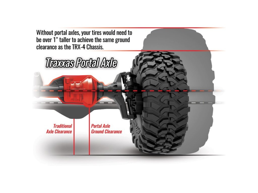 Šasi TRX-4 používá portálové nápravy s nápravovou převodovkou. Nápravová převodovka zvyšuje světlou výšku, snižuje namáhání převodovky, kardanových hřídelí a dále se snižuje torzní síla - model se méně naklápí.
