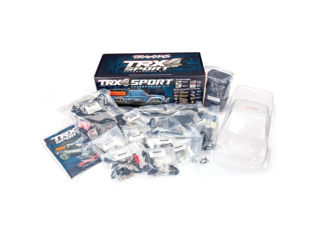 Balení obsahuje model auta Traxxas TRX-4 Sport 1:10 Kit - jednotlivé díly jsou nabaleny v sáčcích a model je nutné složit. Čirá nenabarvená karoserie TRX-4 Sport. Střešní nosič s příslušenstvím a podrobný obrázkový návod. Model neobsahuje elektroniku, RC soupravu, ani motor.