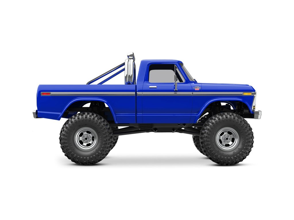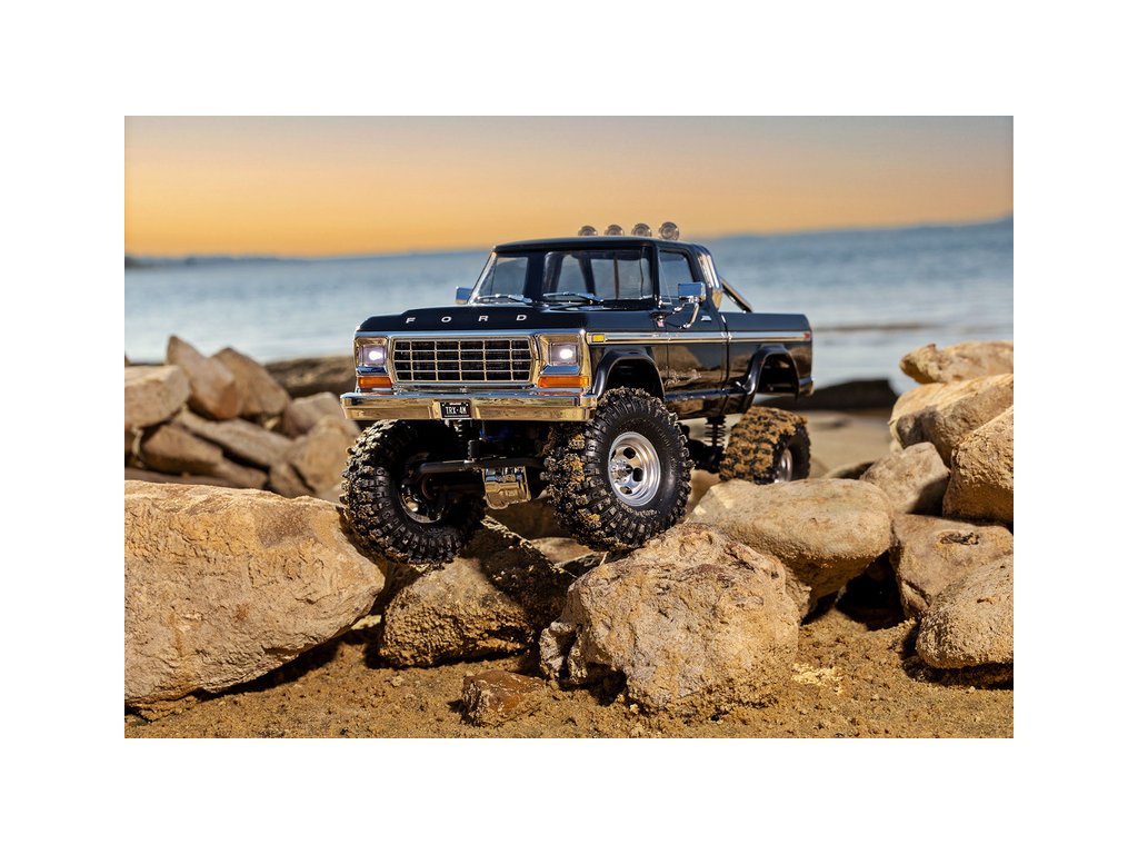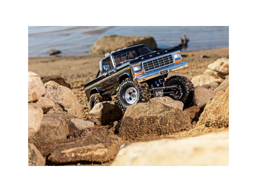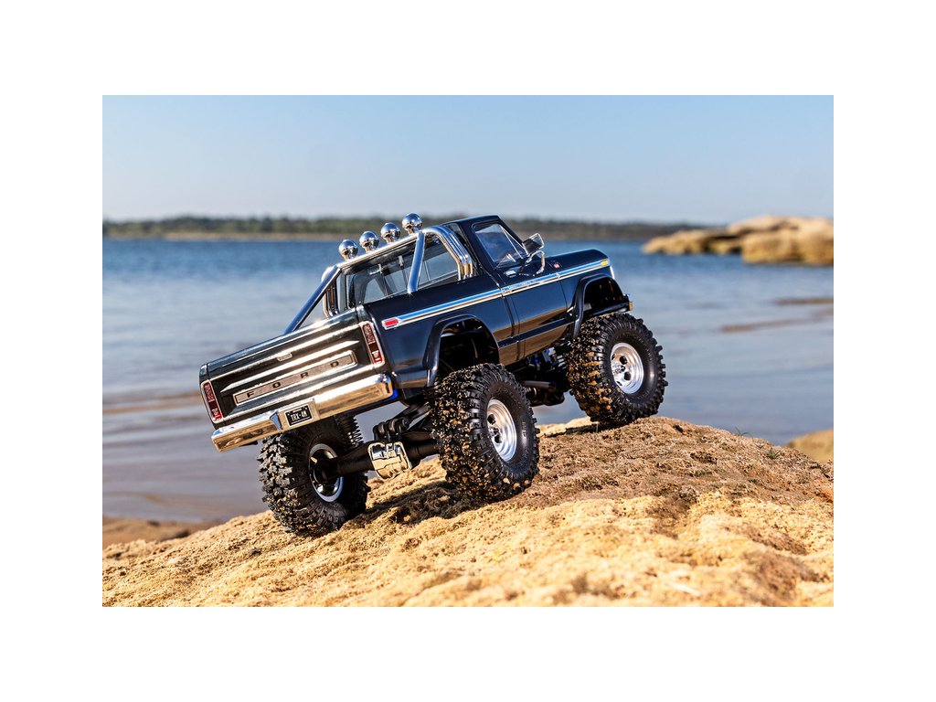 RC model auta Traxxas TRX-4M Ford F-150 1979 v edici High Trail s vyšší světlou výškou, většími koly, úžasnou všestranností a schopnostmi. Kovový podvozek, 4-bodové zavěšení, olejové tlumiče, úhel zatáčení 45°, bez-sponková karoserie, přední LED světlomety. Baterie 2S LiPo a USB nabíječ.