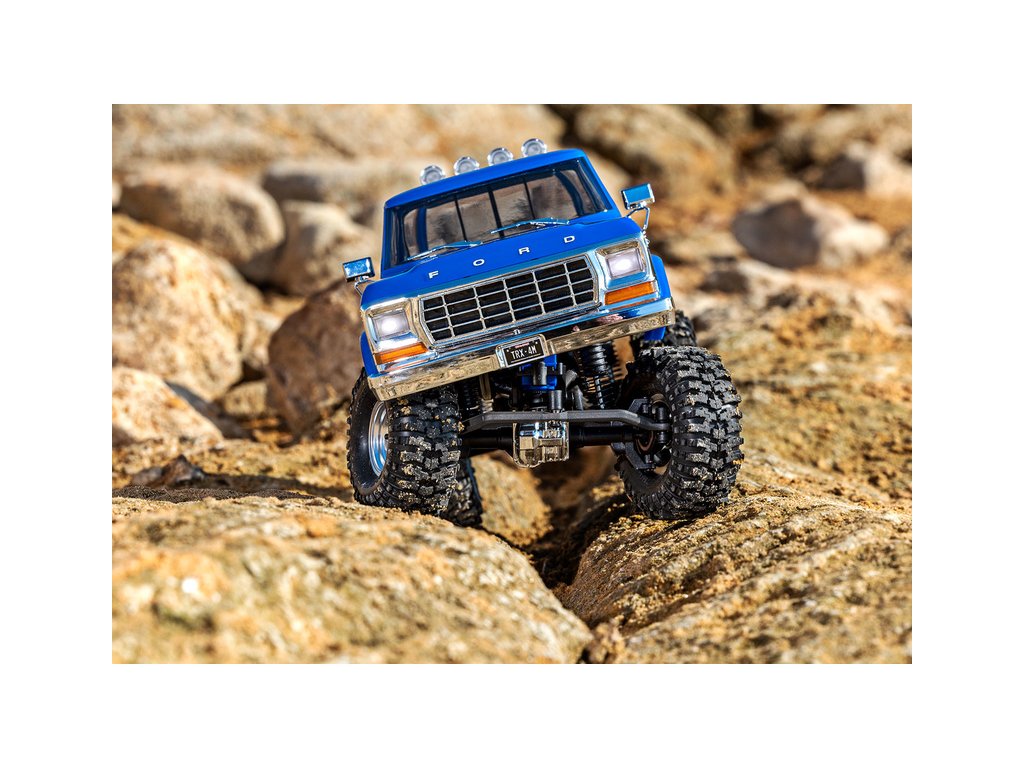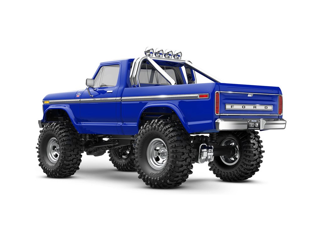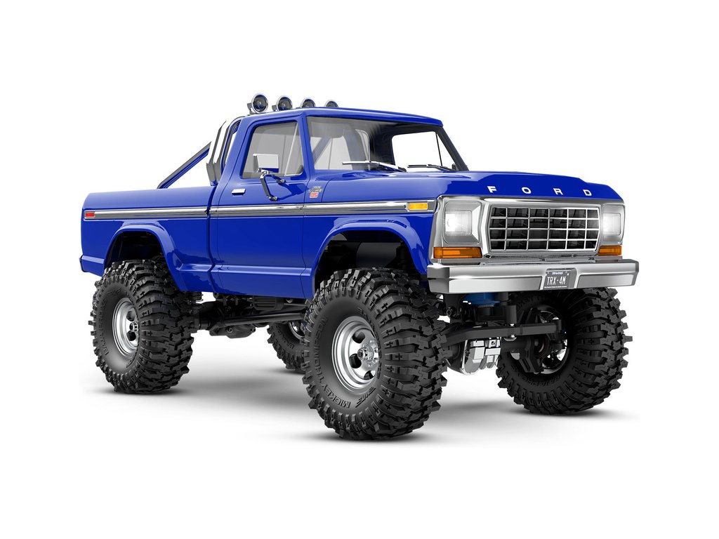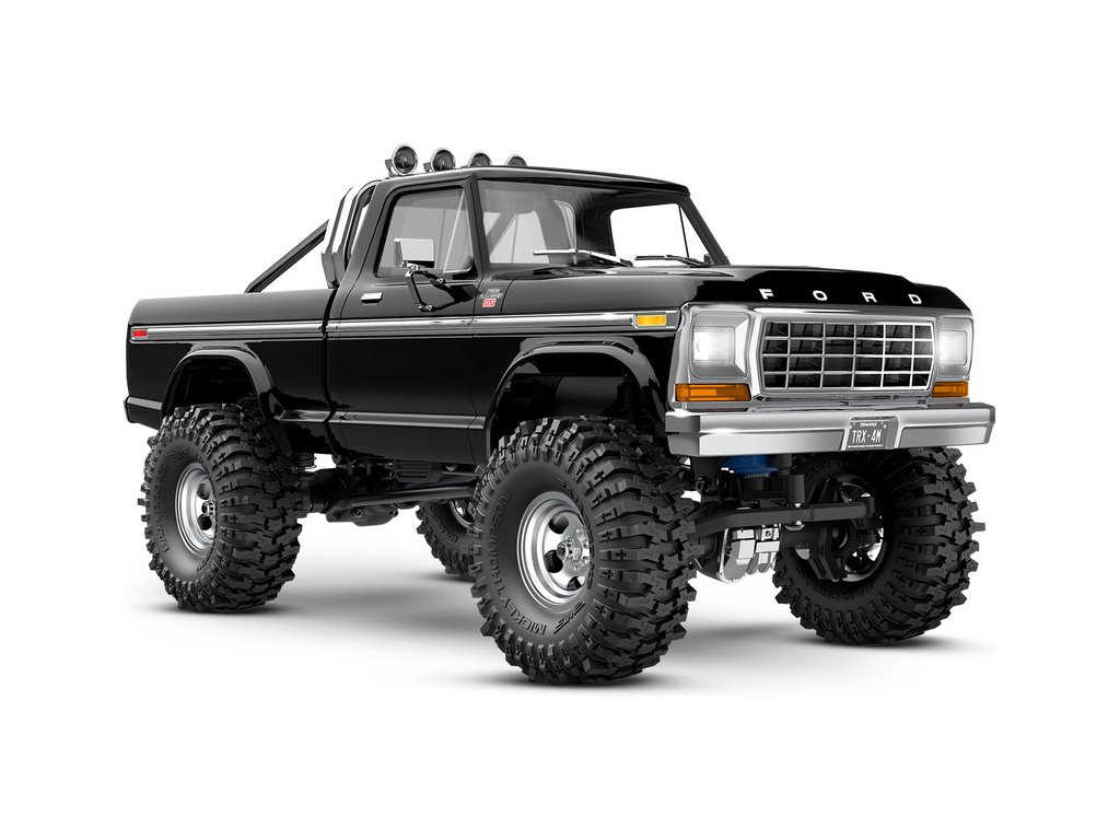 RC model auta Traxxas TRX-4M Ford F-150 1979 v edici High Trail s vyšší světlou výškou, většími koly, úžasnou všestranností a schopnostmi. Kovový podvozek, 4-bodové zavěšení, olejové tlumiče, úhel zatáčení 45°, bez-sponková karoserie, přední LED světlomety. Baterie 2S LiPo a USB nabíječ.