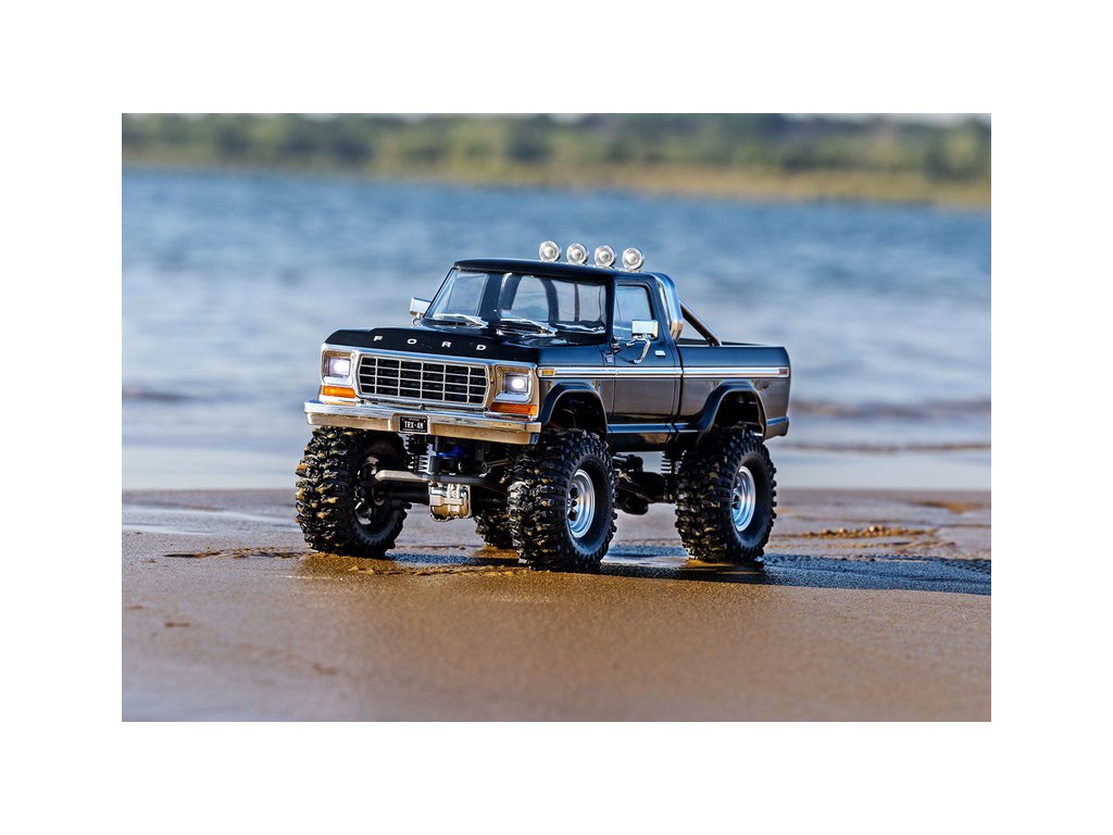 RC model auta Traxxas TRX-4M Ford F-150 1979 v edici High Trail s vyšší světlou výškou, většími koly, úžasnou všestranností a schopnostmi. Kovový podvozek, 4-bodové zavěšení, olejové tlumiče, úhel zatáčení 45°, bez-sponková karoserie, přední LED světlomety. Baterie 2S LiPo a USB nabíječ.