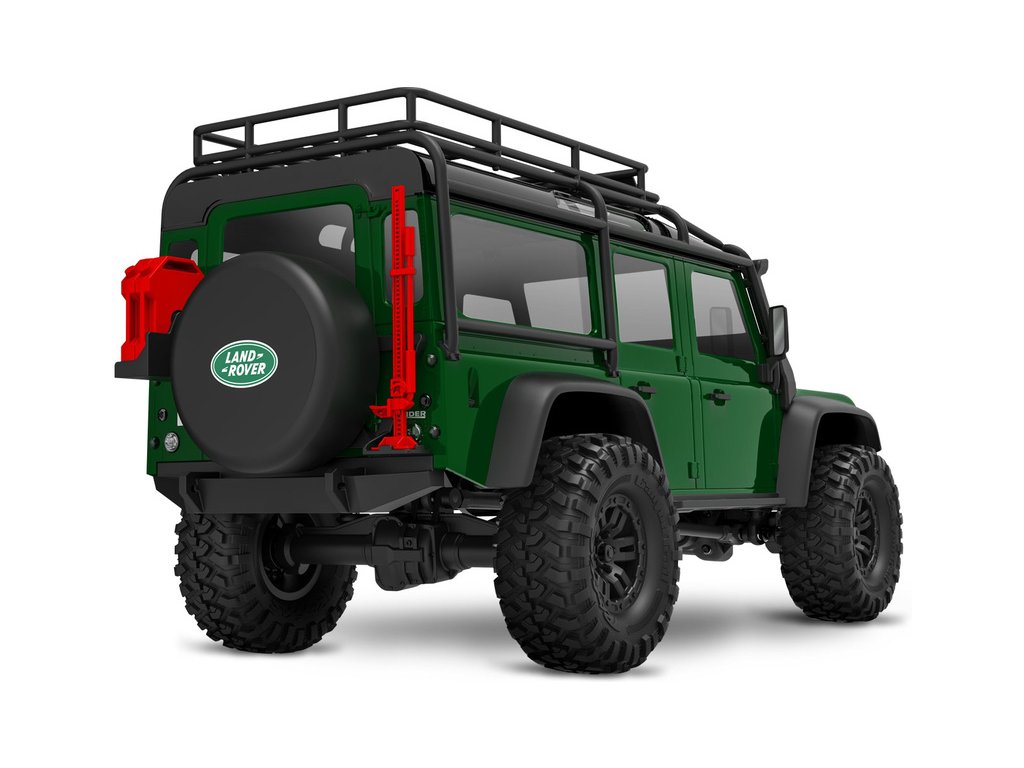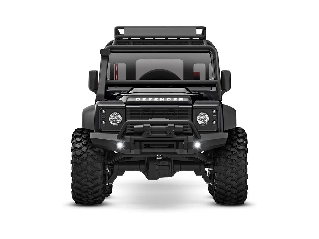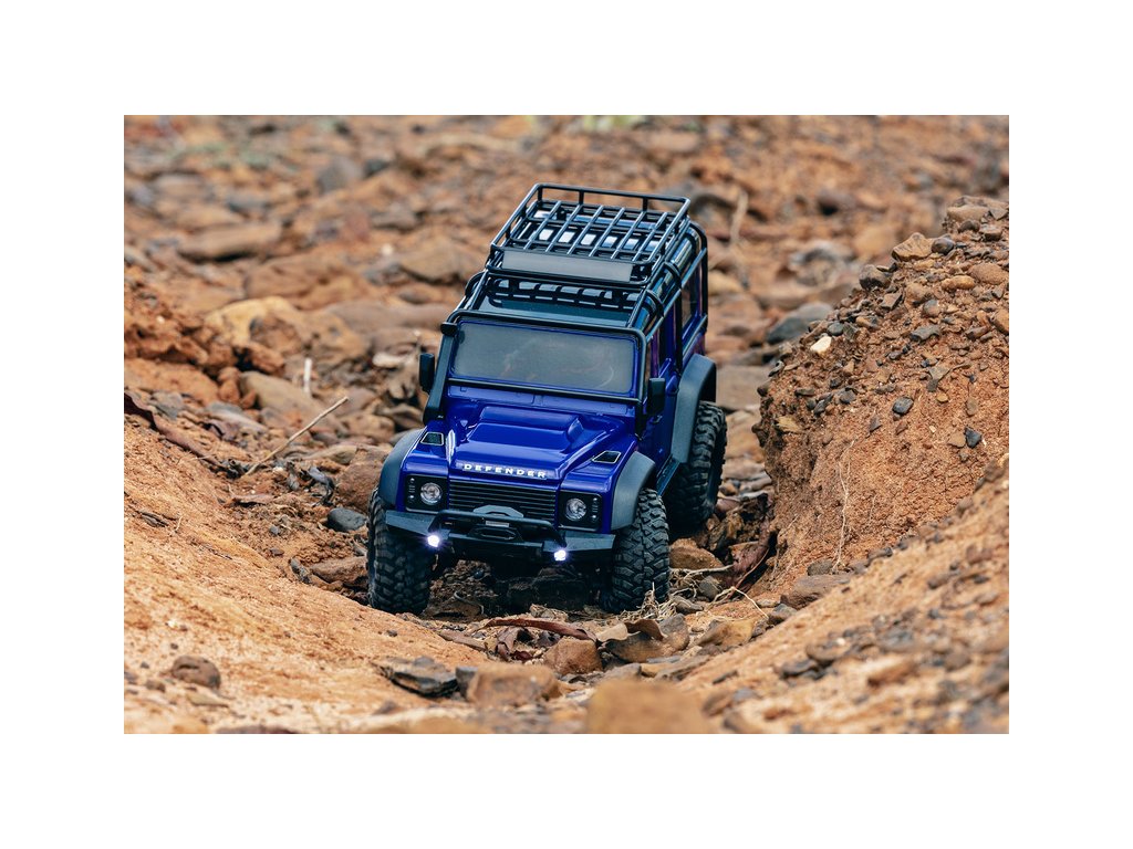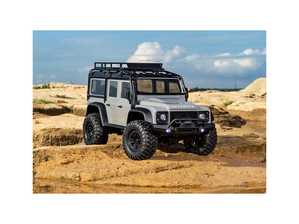 RC model auta Traxxas TRX-4M Land Rover Defender v měřítku 1:18 s úžasnou všestranností a schopnostmi. Kovový rám podvozku se 4-bodovým zavěšením, olejové tlumiče, úhel zatáčení 45°, licencovaná bez-sponková karoserie, LED osvětlení v nárazníku. Baterie 2S LiPo a USB nabíječ.
