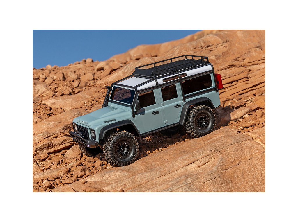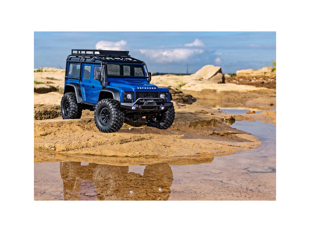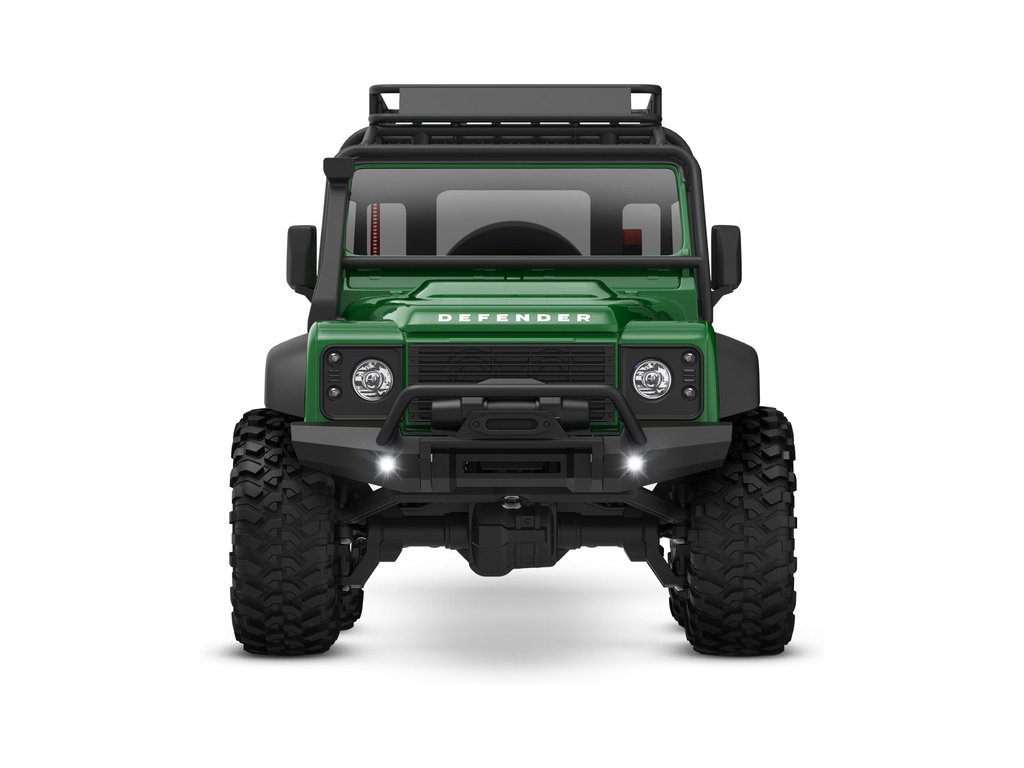RC model auta Traxxas TRX-4M Land Rover Defender v měřítku 1:18 s úžasnou všestranností a schopnostmi. Kovový rám podvozku se 4-bodovým zavěšením, olejové tlumiče, úhel zatáčení 45°, licencovaná bez-sponková karoserie, LED osvětlení v nárazníku. Baterie 2S LiPo a USB nabíječ.