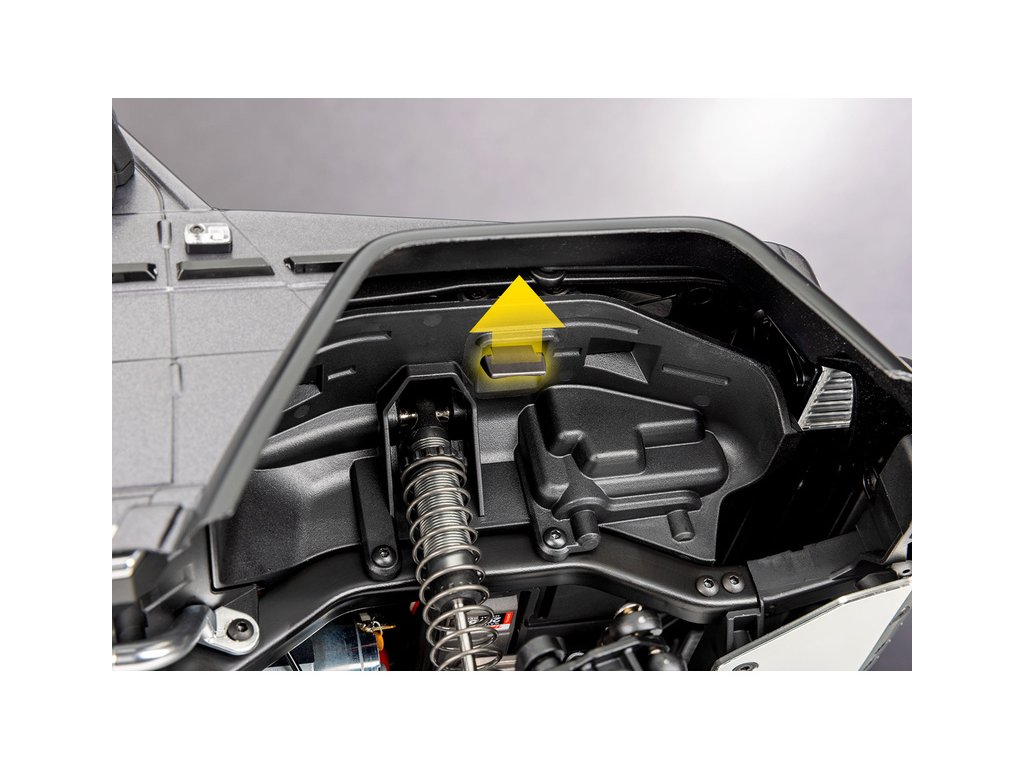 Unikátní systém uchycení karoserie pomocí zobáčků v podbězích kol, umožňuje rychlou výměnu baterie a čistý vzhled modelu neruší klipy.
