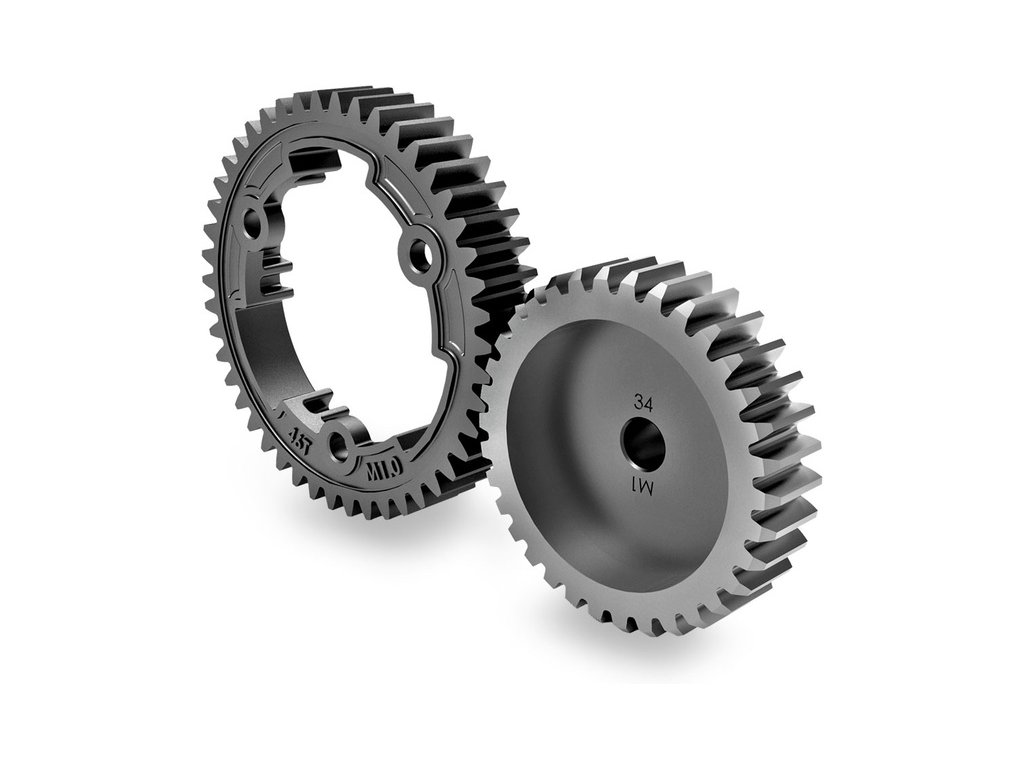 - Kompletně použita ozubená kola a pastorky v metrických modulech ozubení.