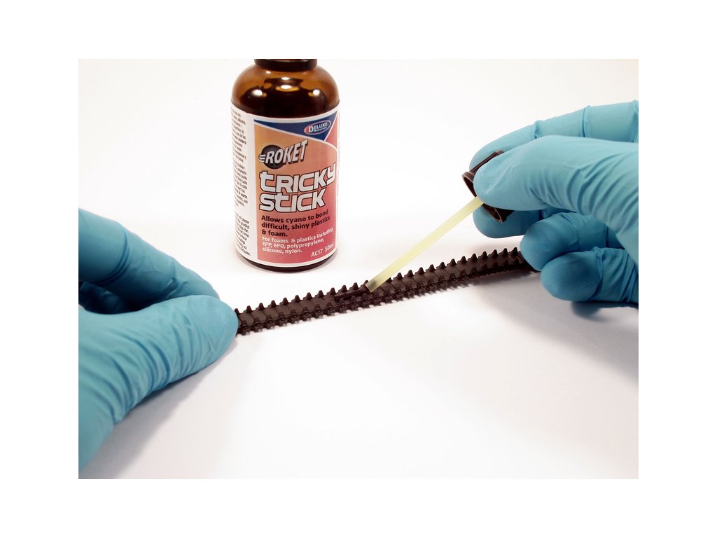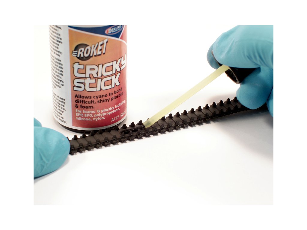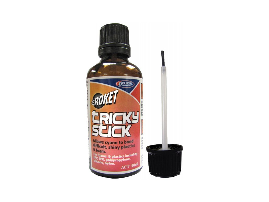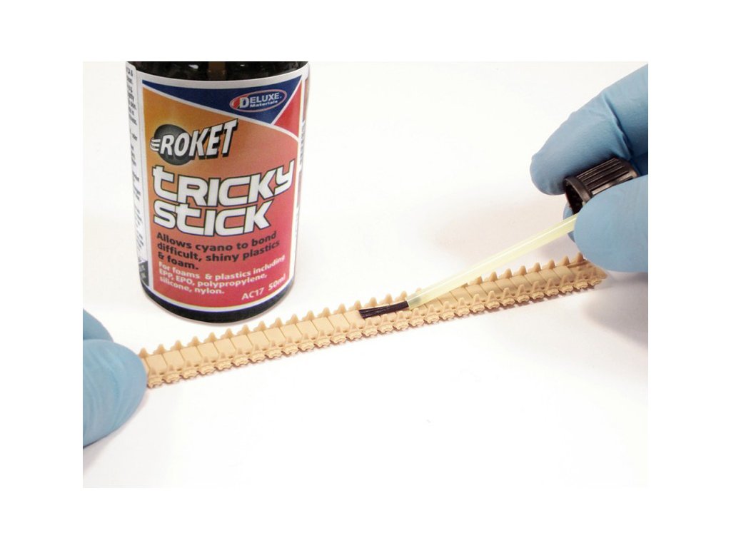 Tricky Stick je přípravek pro lepení těžko lepitelných plastů vteřinovými lepidly. Aktivuje povrch plastů pro lepší přilnutí lepidla. Nanáší se na místa, která mají být lepeny. Určeno pro nepolární plasty, jako je např. polyetylén, polypropylén, silikony, termoplastické elastomery, teflon a pod.