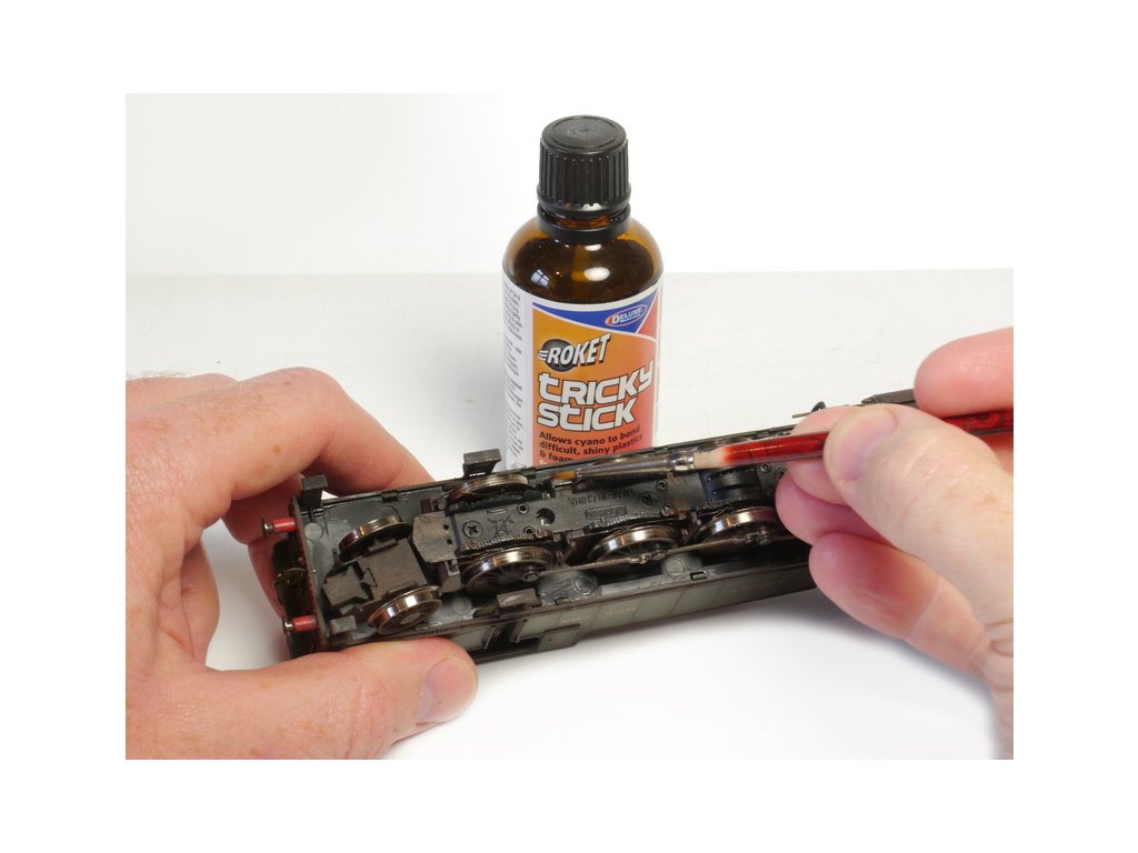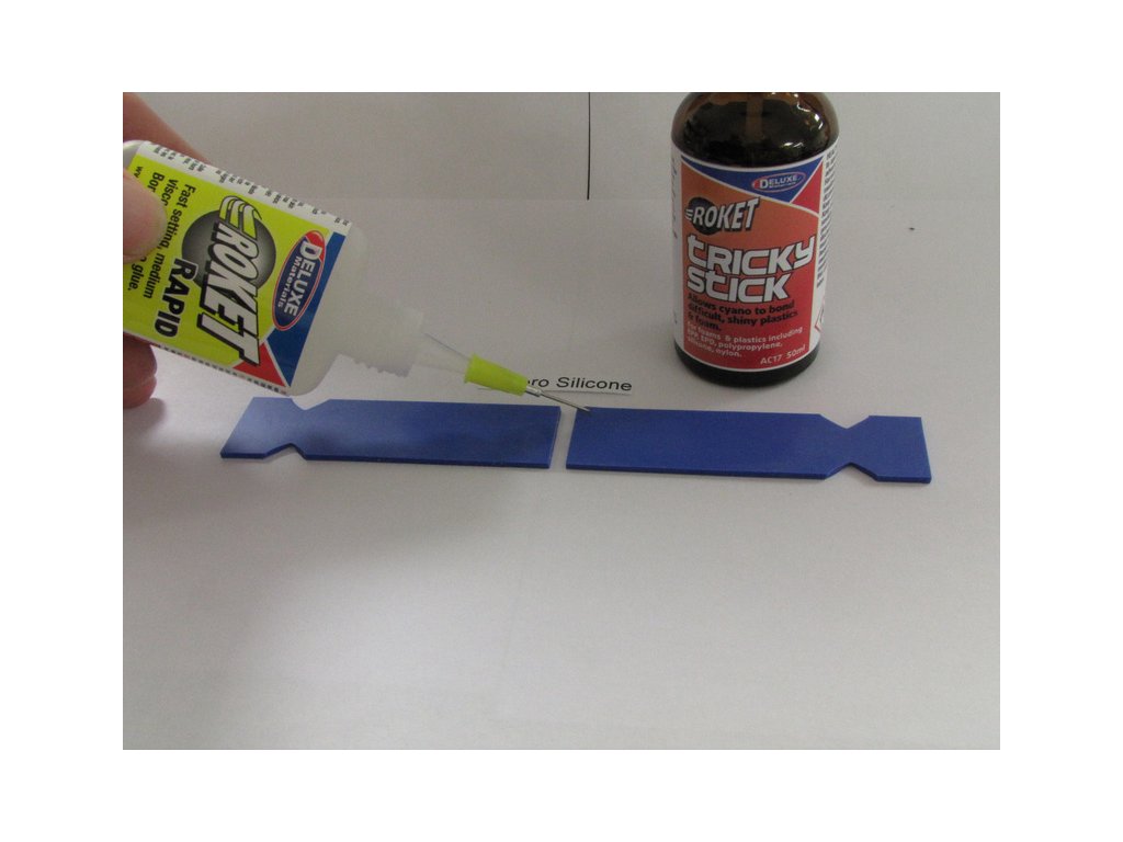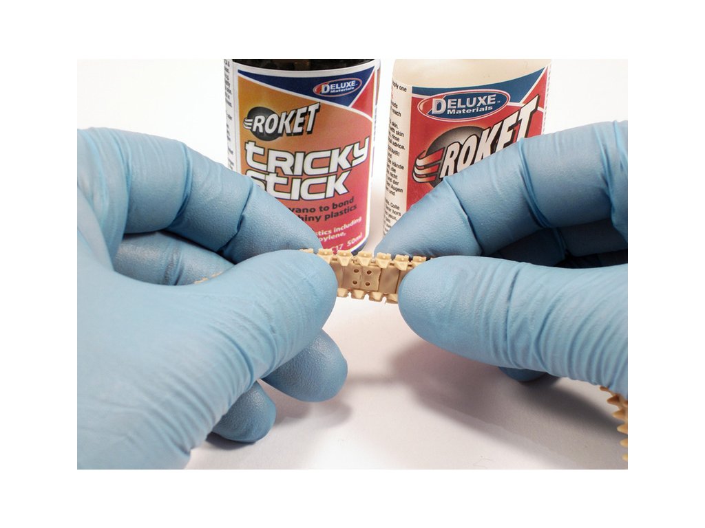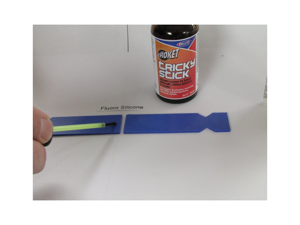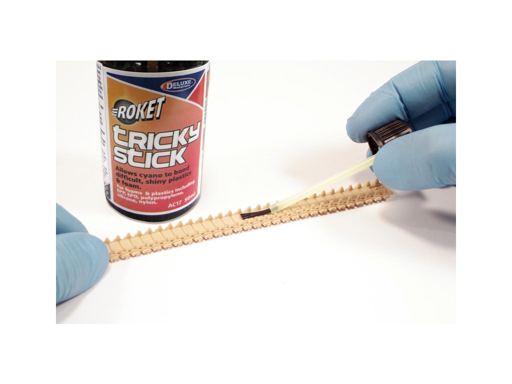 Tricky Stick je přípravek pro lepení těžko lepitelných plastů vteřinovými lepidly. Aktivuje povrch plastů pro lepší přilnutí lepidla. Nanáší se na místa, která mají být lepeny. Určeno pro nepolární plasty, jako je např. polyetylén, polypropylén, silikony, termoplastické elastomery, teflon a pod.
