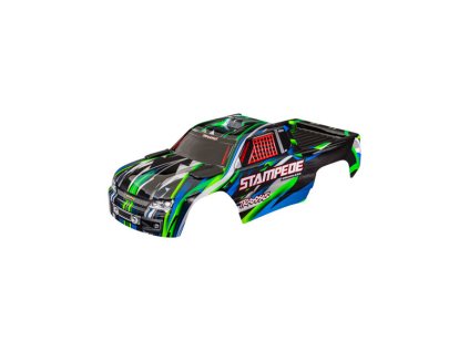 Traxxas karosérie Stampede zelená (bezsponková), hotová nabarvená, aplikované obtisky. Vhodná i pro Stampede VXL. Včetně předního a zadního bezsponkového držáku karoserie.