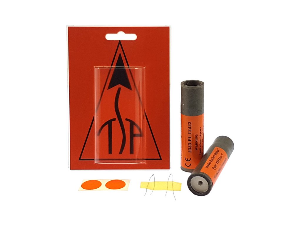 Obsahem balení jsou 2 kusy raketových motorků TSP E12-6 včetně elektrického prostředku zážehu a návod k použití v češtině a slovenštině.