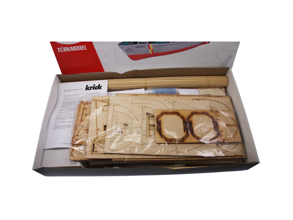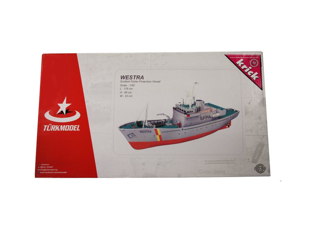 Stavebnice modelu hlídkového člunu FPV Westra od Turkmodel, v měřítku 1:50, s délkou 1180 mm. Stavba lodi vhodná pro pokročilé modeláře. Model obsahuje dřevěný překližkový trup doplněný o plaňkové lišty. Dřevěné díly jsou přesně a čistě laserem řezané. Dále model obsahuje kvalitní díly z resinovaného 3D tisku. Hlavní můstek má vybavený interiér. Stavebnice může být jako statický model, nebo ji lze sestavit jako plovoucí model a doplnit o pohon, elektroniku a RC soupravou. (Není obsahem balení).