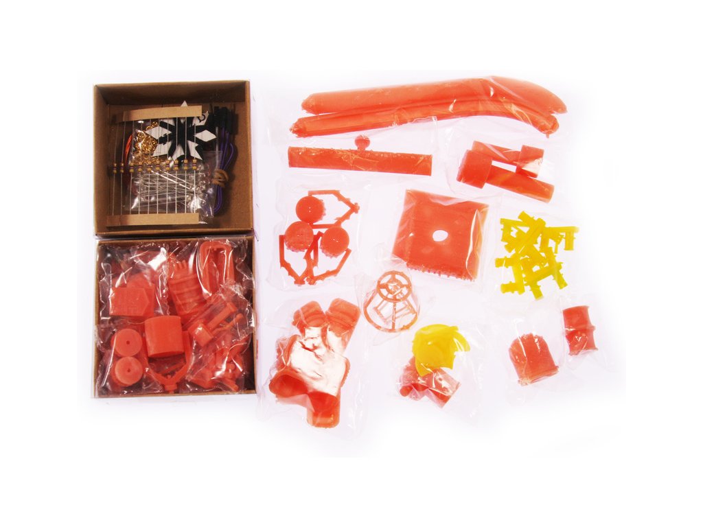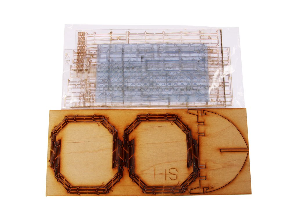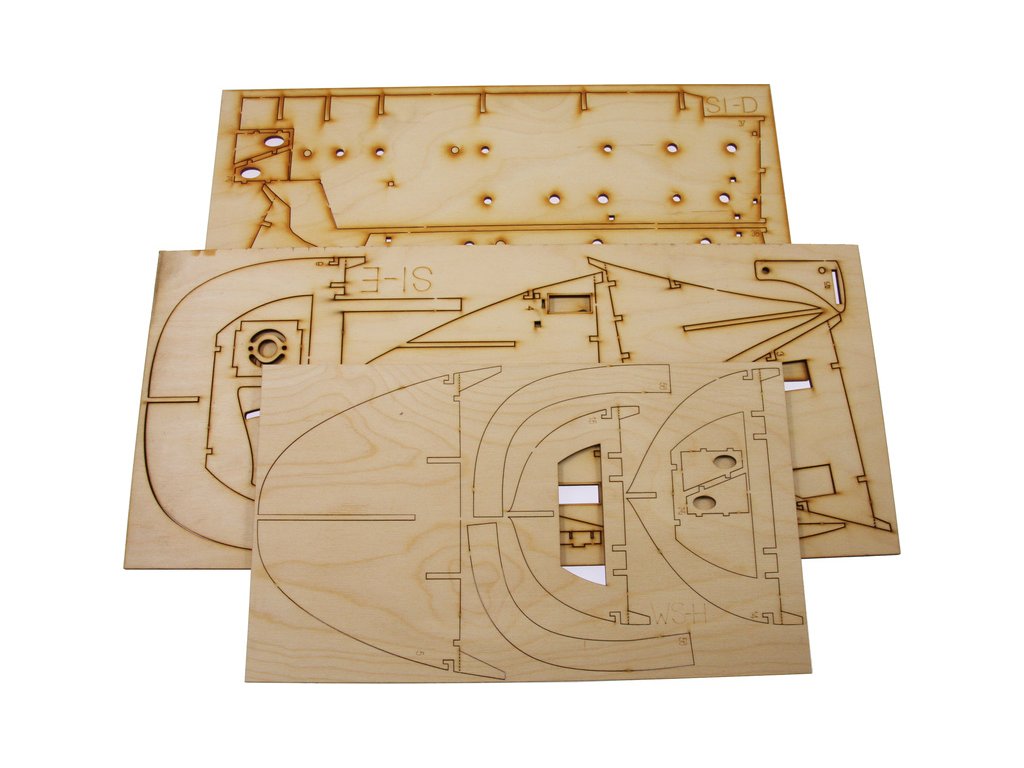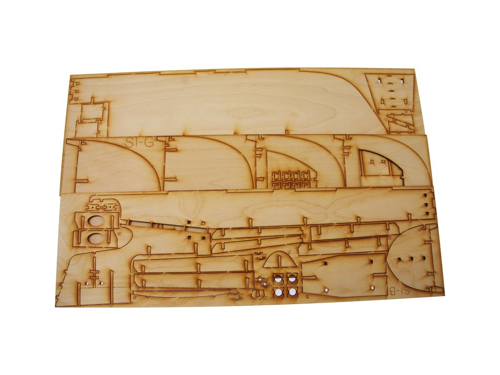 Po otevření víka krabice naleznete obsáhlou sadu dřevěných dílů modelu z překližky, sadu lišt, kovové díly, plastové výlisky a drobné součásti uzavřené v sáčcích, sadu podrobných výkresů a manuál.