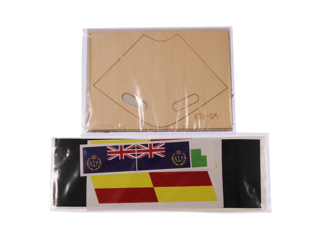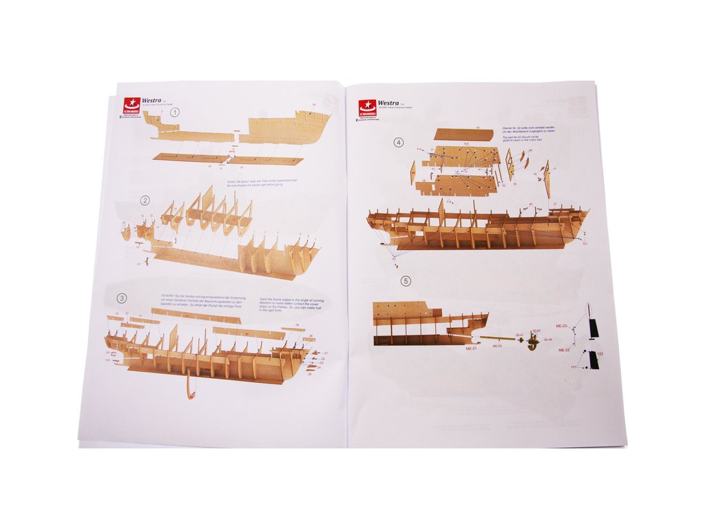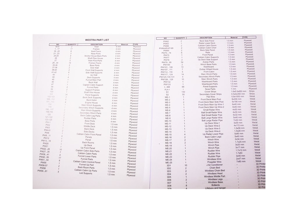 Balení obsahuje díly pro stavbu lodi FPV Westra: díly překližky, lišty, laserem řezané dřevěné díly, maketové díly 3D tisku. Obrázkový manuál EN.