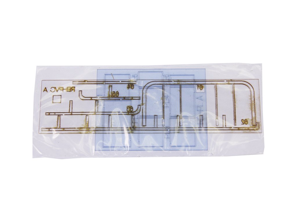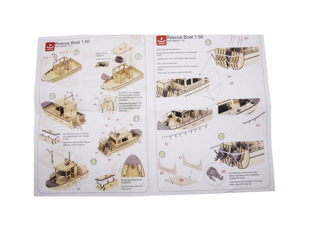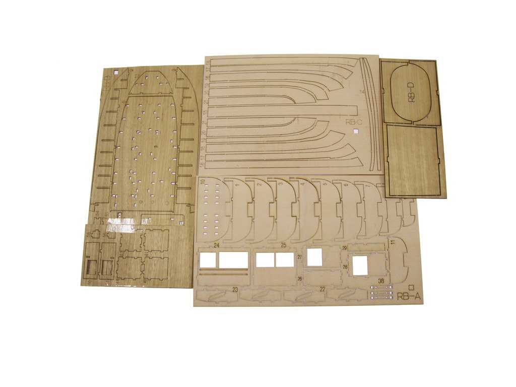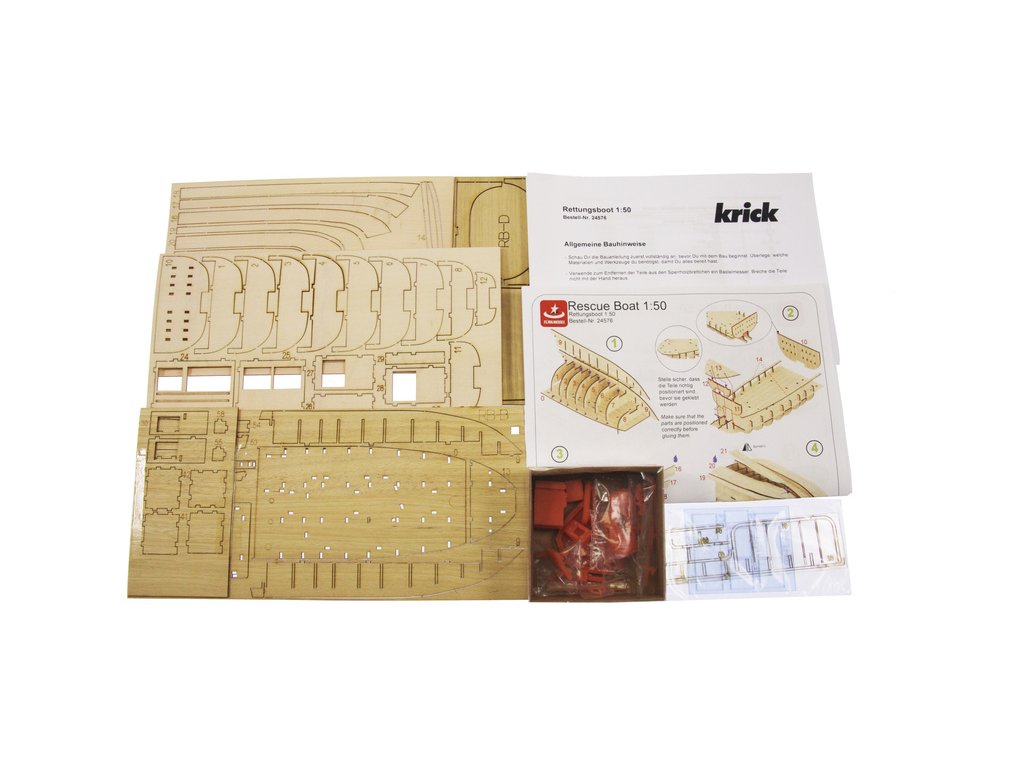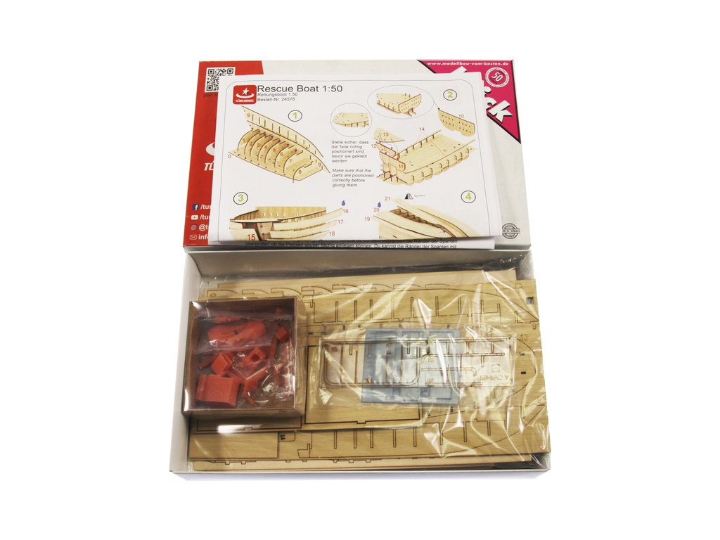 Balení Türkmodel záchranný člun 1:50 kit obsahuje sady překližkových laserem vyřezaných dílů, sáčky s drobnými díly, sadu výkresů a vícejazyčný manuál.