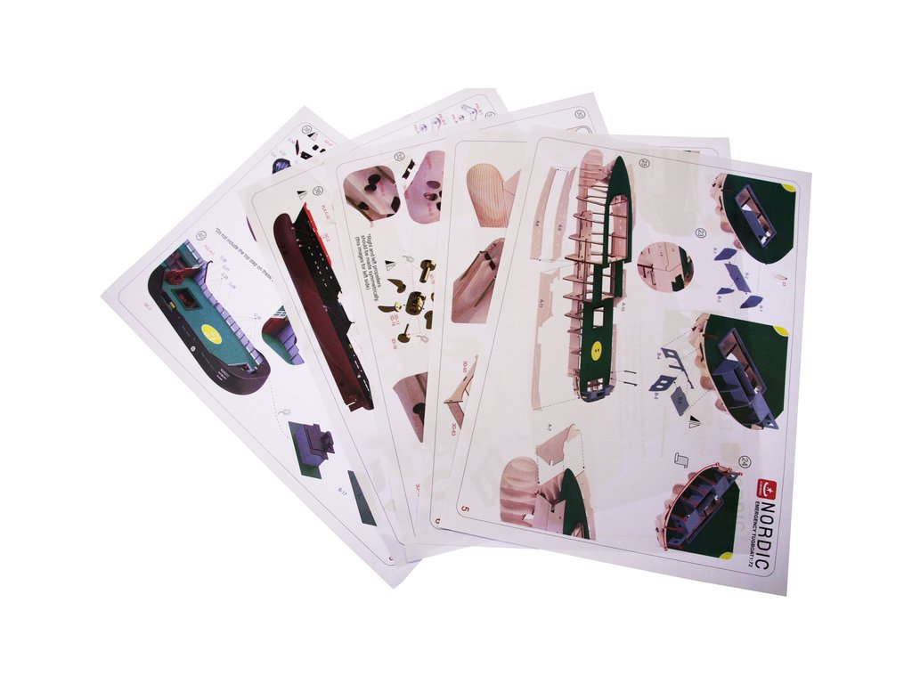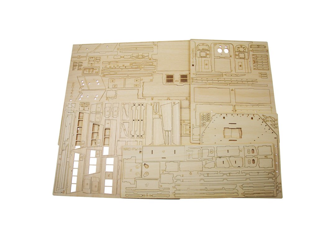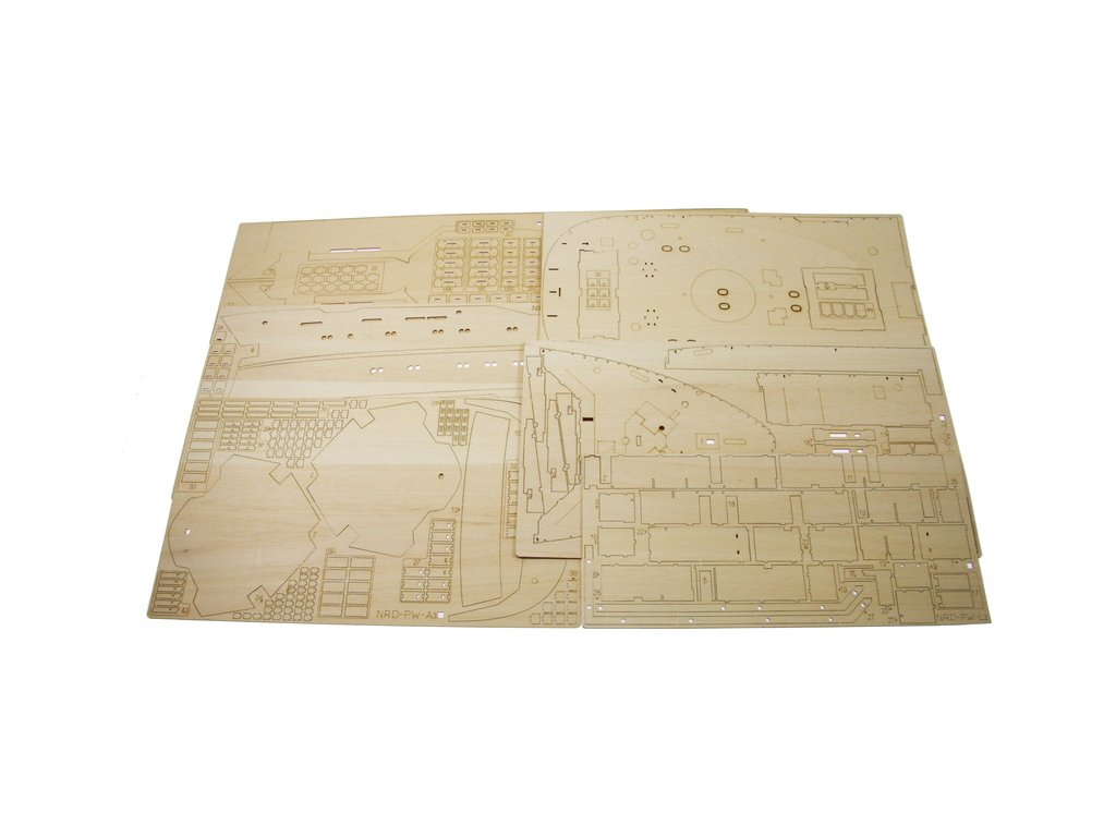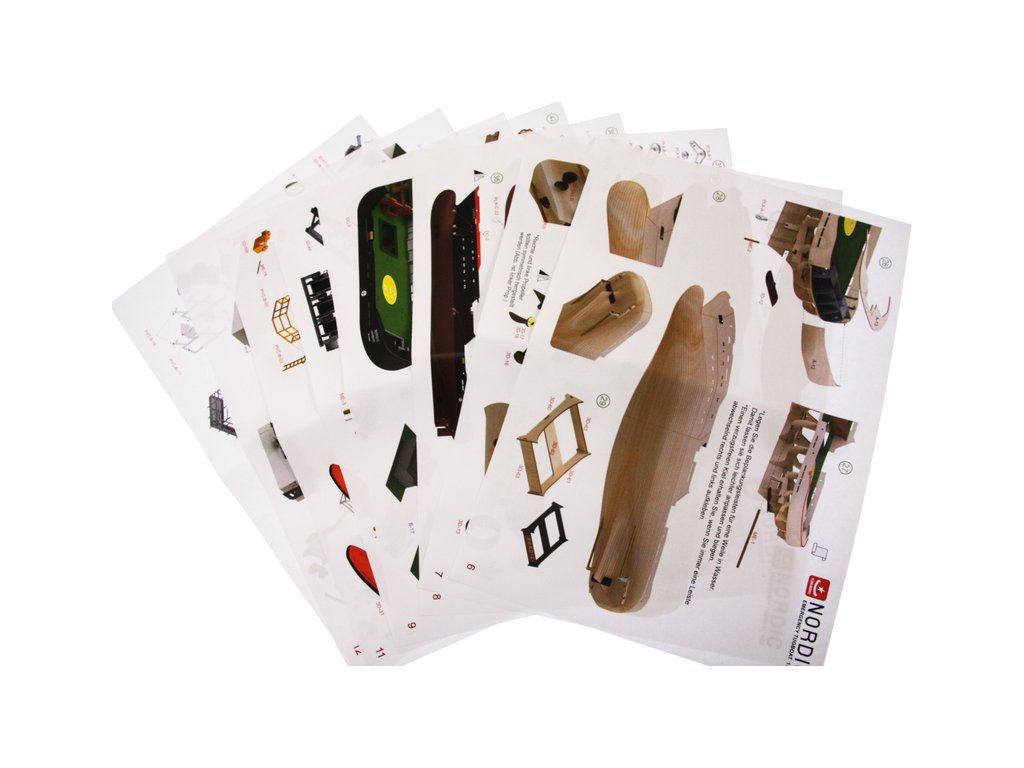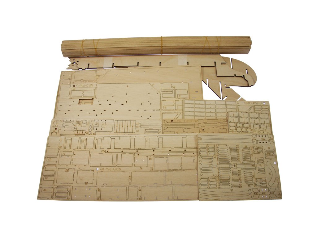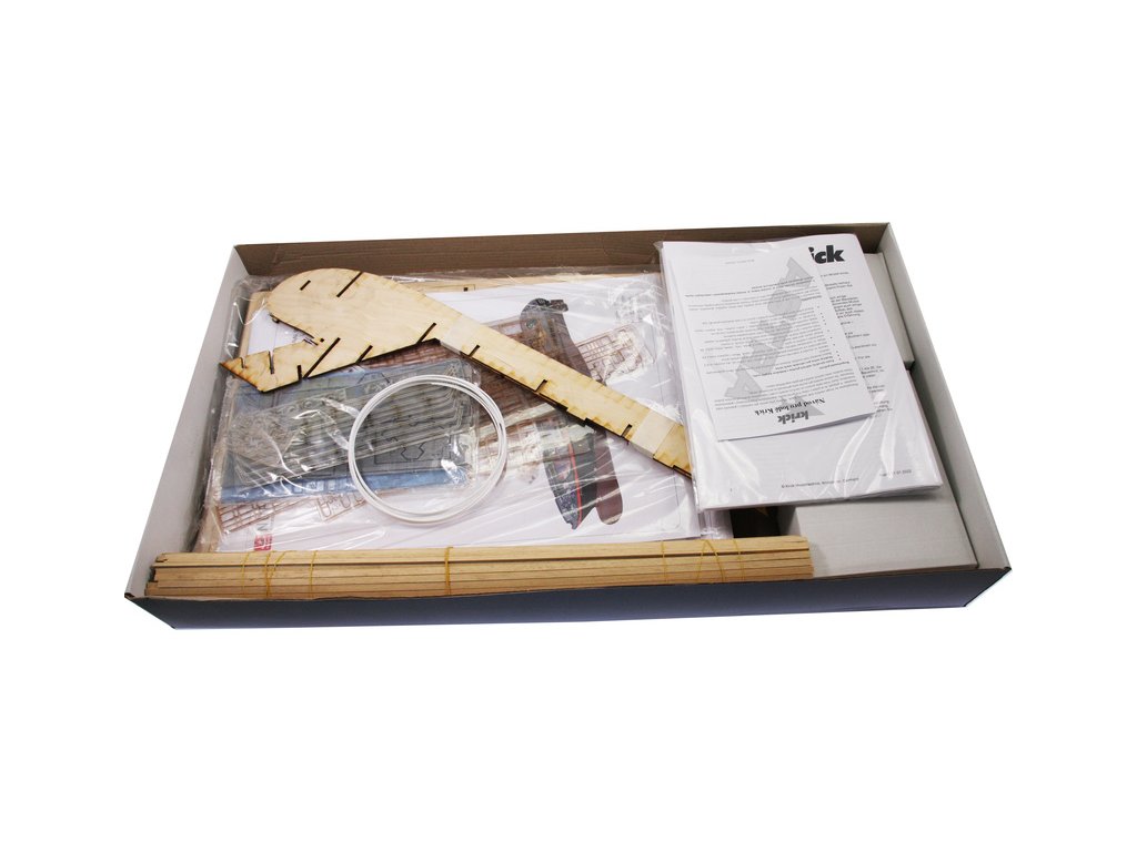 Balení obsahuje díly pro stavbu lodi: díly překližky, lišty z Abachi, laserem řezané dřevěné díly, maketové díly 3D tisku. Obrázkový manuál EN.