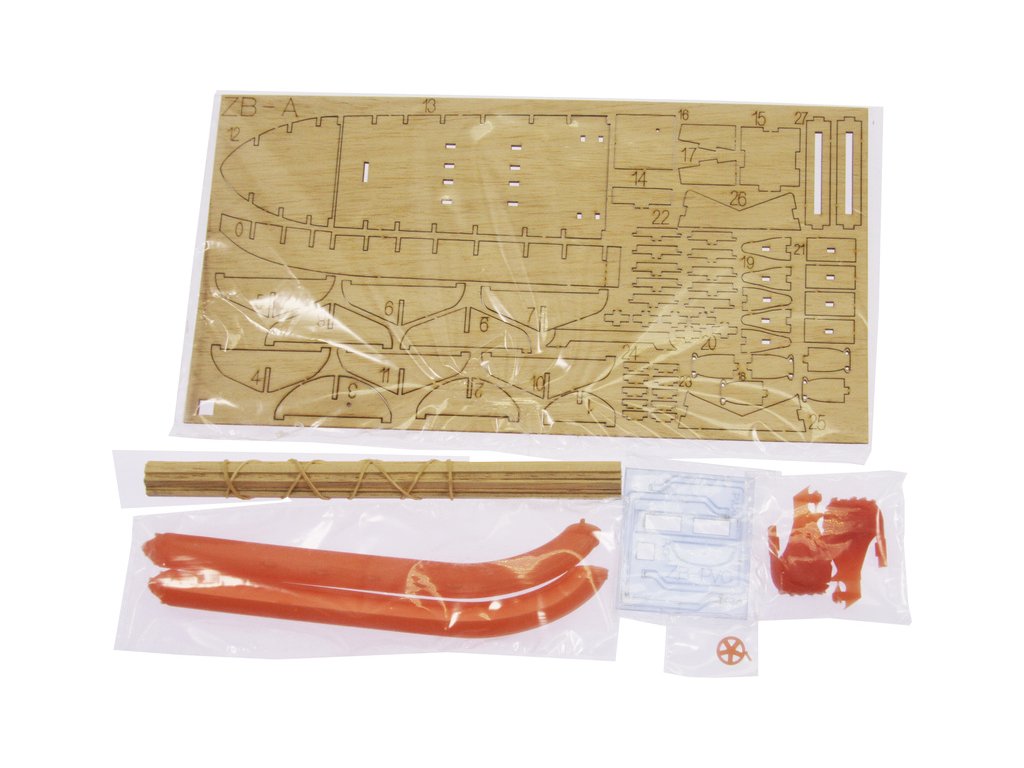 Po otevření víka krabice naleznete dřevěné díly modelu z překližky, drobné součásti uzavřené v sáčcích, součásti z resinu, sadu výkresů a manuál.