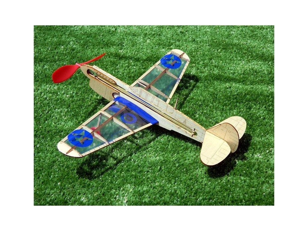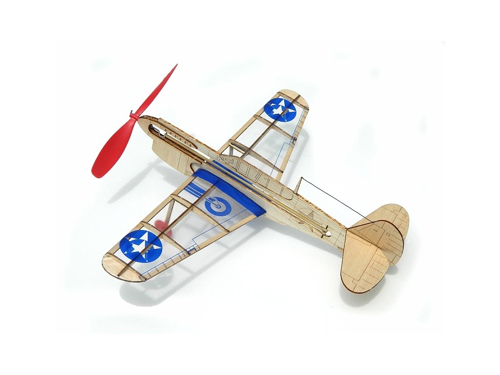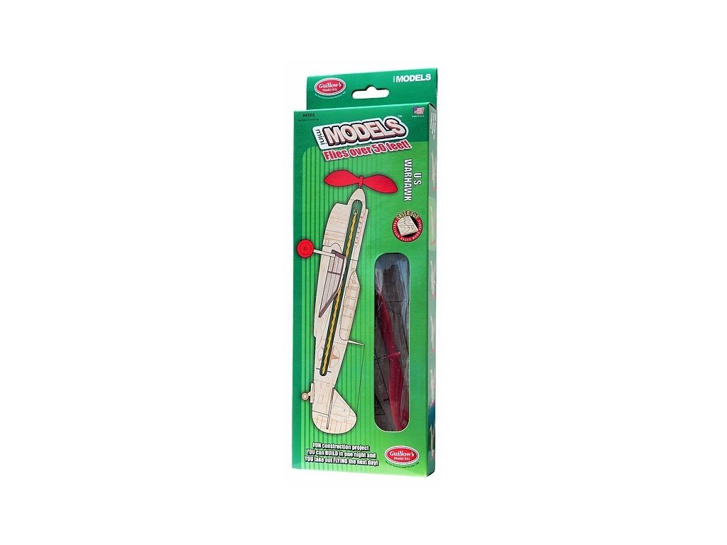 Rychlostavebnice stínové polomakety P-40 Warhawk o rozpětí 286mm s pohonem gumovým svazkem z laserem vyřezávaných balsových dílů.