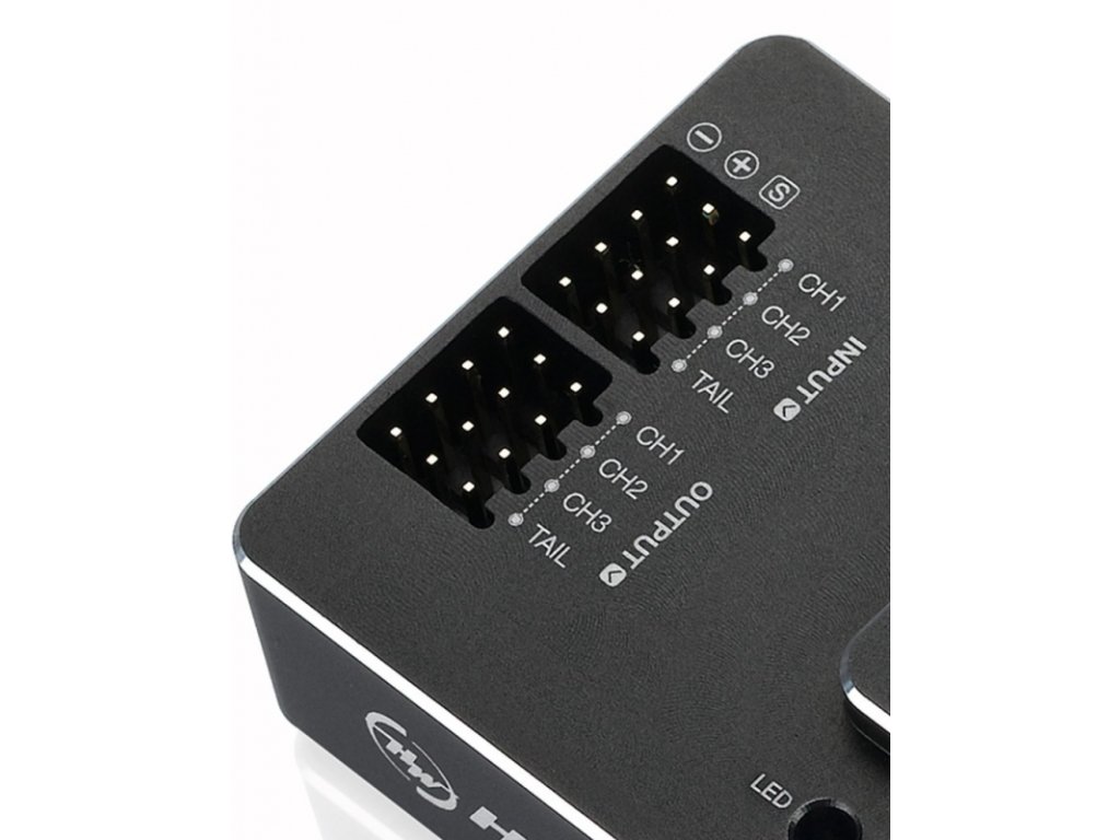 - Vrtulník: Kabely se signálem pro serva desky cykliky (CH1, CH2, CH3) a vyrovnávací rotor (TAIL) z flybarless řídící jednotky nebo přijímače zapojte do zásuvek skupiny „INPUT“. Serva desky cykliky a vyrovnávacího rotoru připojte do odpovídajících zásuvek skupiny „OUTPUT“.