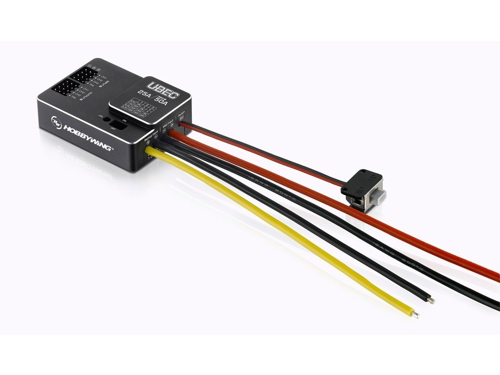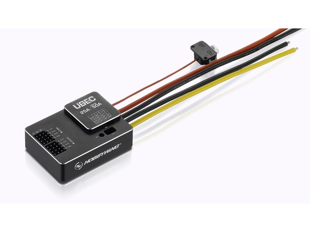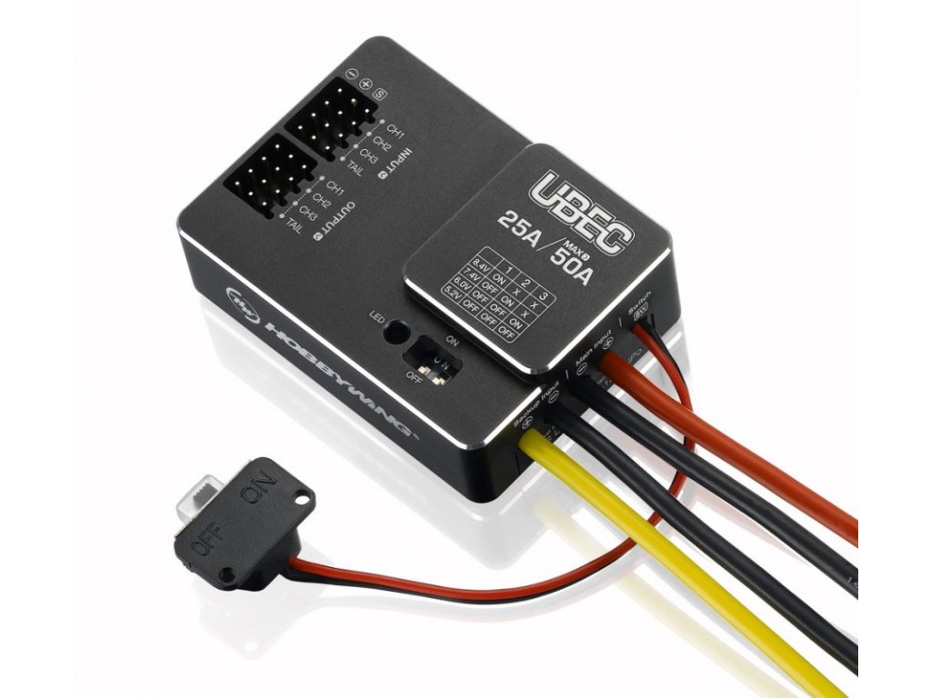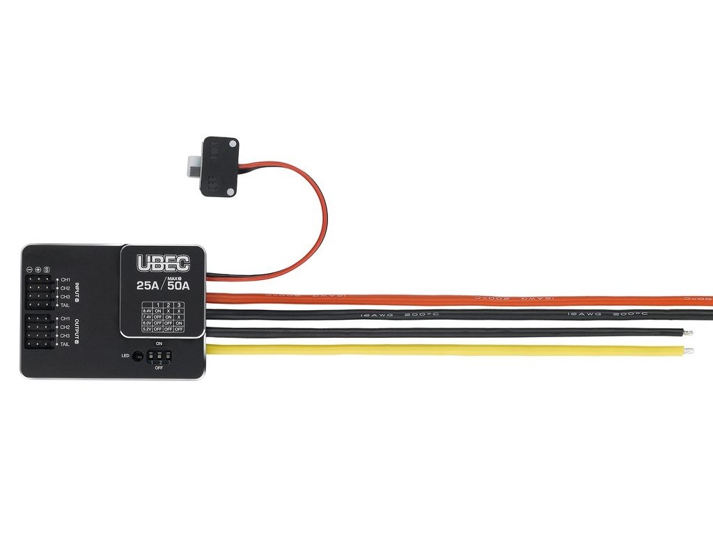 UBEC je spínaný stejnosměrný stabilizátor napájení; napájí se z 3-18S LiPo akumulátoru, vstupní napětí sníží na úroveň vhodnou pro napájení přijímačů a palubní elektroniky RC modelů a výstupní napětí stabilizuje na nastavené hodnotě (5,2-8,4 V). Zatížitelnost UBEC je 25 A trvale, 50 A špičkově. Díky tomu je vhodný pro velké vrtulníky nebo obří modely letadel s větším počtem silných serv.