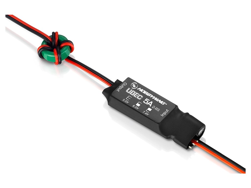 UBEC 5 A je spínaný stejnosměrný stabilizátor napájení; napájí se z 2-8S LiPo akumulátoru, vstupní napětí sníží na úroveň vhodnou pro napájení přijímačů a palubní elektroniky RC modelů a výstupní napětí stabilizuje na nastavené hodnotě (5,0 V, 6,0 V nebo 7,4 V). Zatížitelnost UBEC je 5 A trvale, 15 A špičkově. Díky tomu je vhodný především pro modely letadel a menší RC vrtulníky, ale také multikoptéry, auta, lodě atd.
