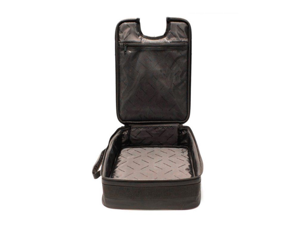 Taška obsahuje vnitřní kapsu na zip pro dokumenty nebo ploché náhradní díly a gumový držák na štítek na vnější straně pro snadnou identifikaci.