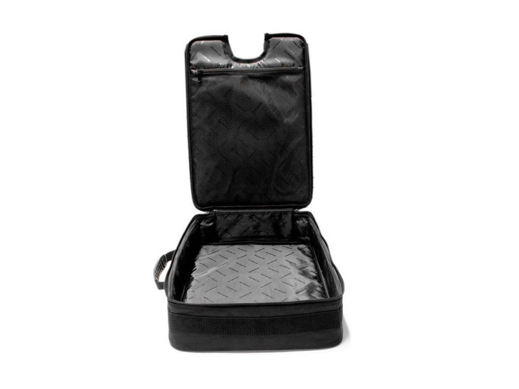Taška obsahuje vnitřní kapsu na zip pro dokumenty nebo ploché náhradní díly a gumový držák na štítek na vnější straně pro snadnou identifikaci.