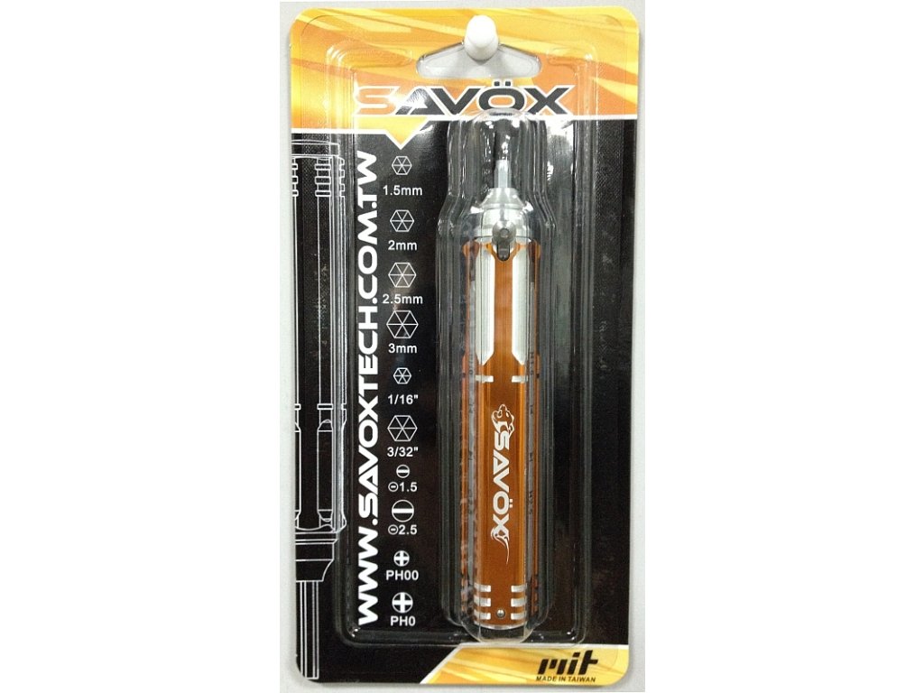 Univerzální nástroj pro šroubování: 1,5 ; 2,0 ; 2,5 ; 3,0 ; 0,050 ; 5/64 ; 1/16 ; 3/32 imbus, 1,5 a 2,5mm plochý šoubovák, PH00 a PH0 křížový šroubovák.