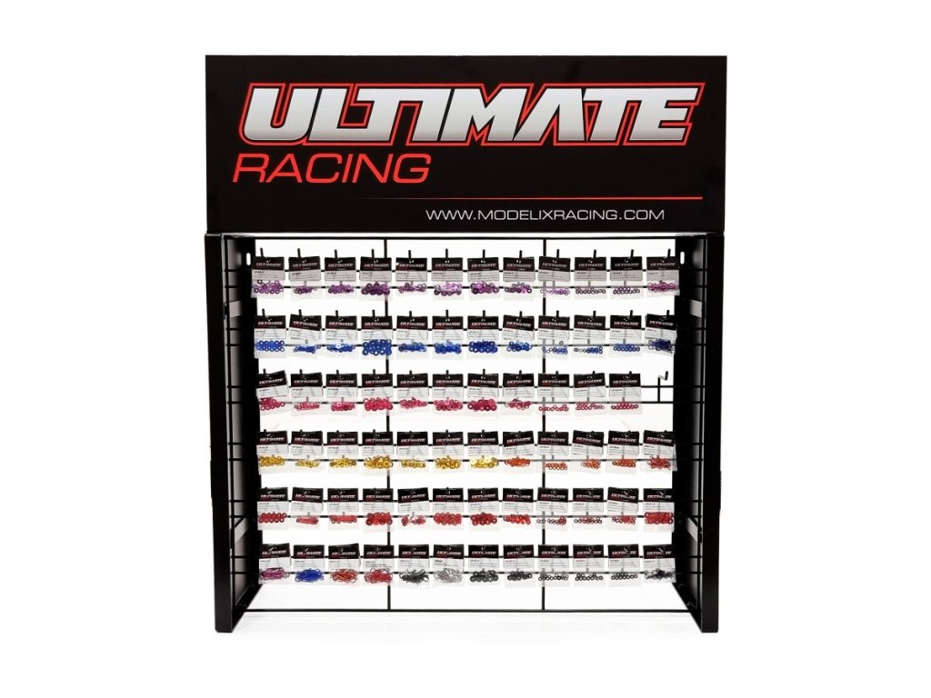 Hliníkový prodejní stojan na matice, podložky a podložky značky Ultimate Racing. Obsahuje 72 háčků pro uložení kompletní řady matic, podložek a sponek karoserie 1/10 a 1/8.