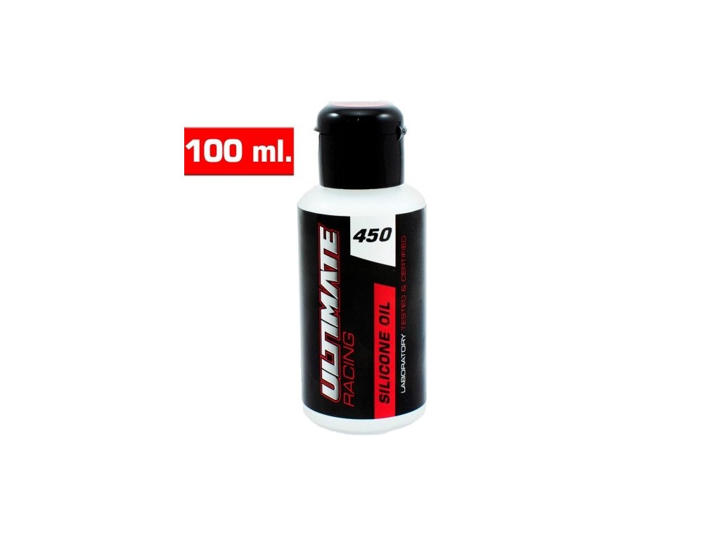 Jedná se o 100 ml lahvičku silikonového oleje Ultimate Racing 450 cSt, který se používá do olejových tlumičů. Tlumičový olej Ultimate Racing je vyroben ze 100% čistého silikonového oleje a v horkém počasí nezřídne a v chladném počasí nezhoustne. Čím vyšší je viskozitní číslo oleje, tím je olej hustší. Silikonový olej Ultimate Racing obsahuje aditiva proti tření, která zajišťuje životnost tlumičů a minimalizují změny viskozity.
