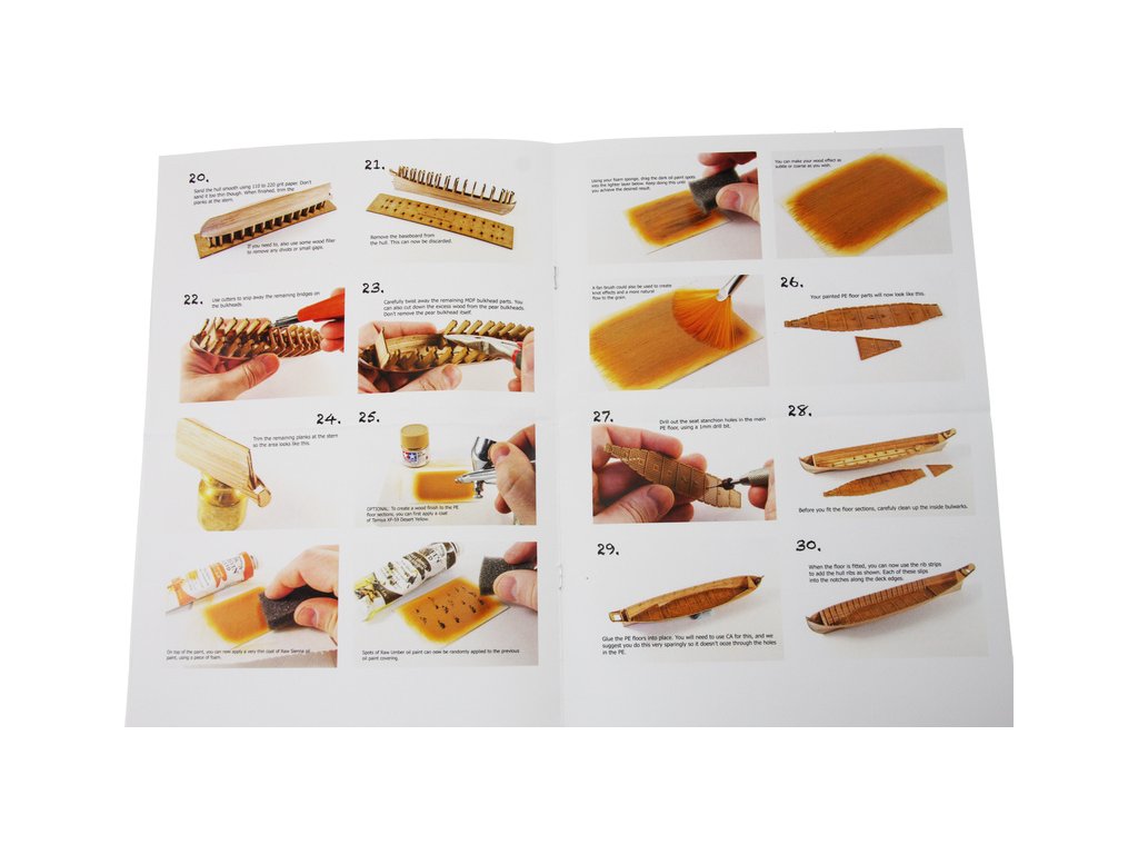 Po otevření víka krabice naleznete dřevěné díly modelu z překližky, sadu mosazných plošných dílů, sadu výkresů a manuál.