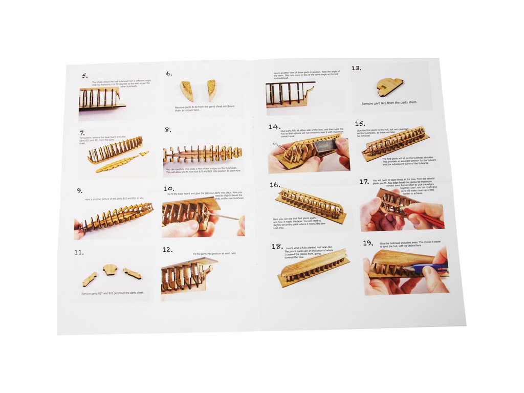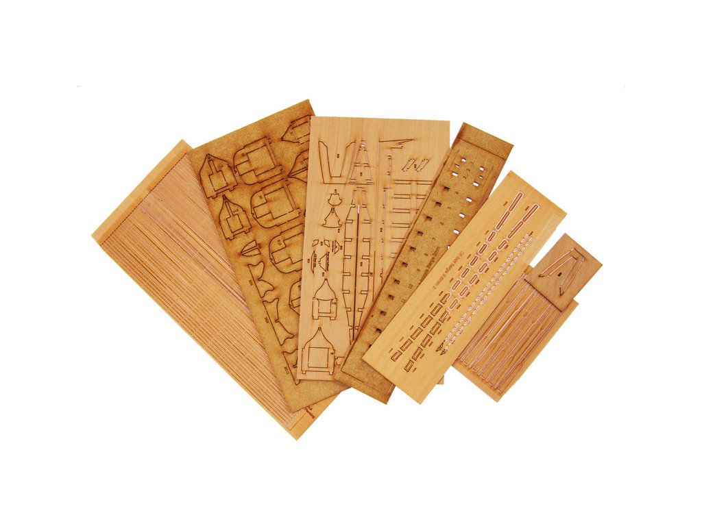 Balení obsahuje sadu překližkových dílů, sadu mosazných desek s drobnými díly, MDF stavební deska s výřezy pro stavbu kýlu a rámu a manuál EN.