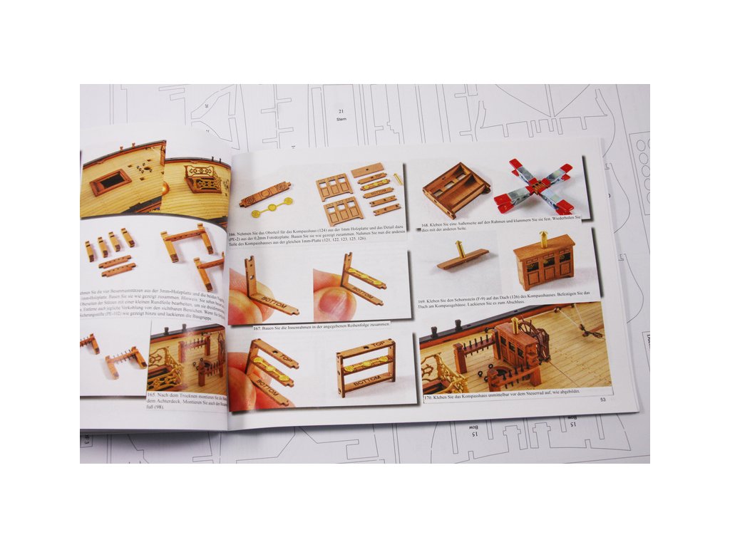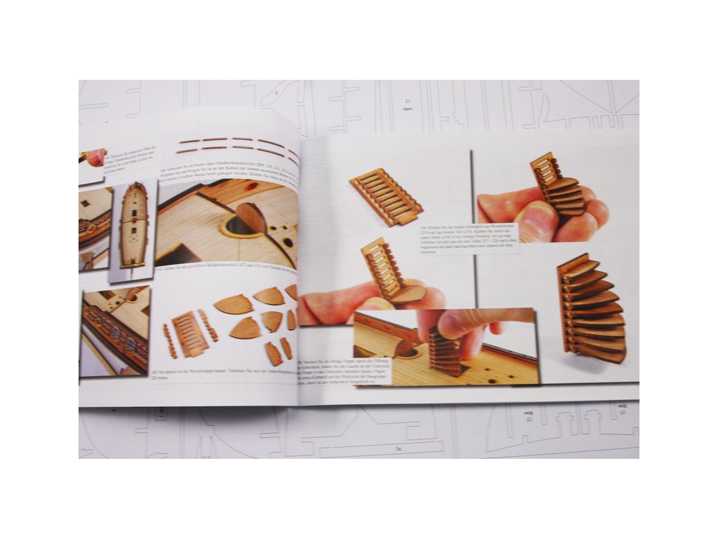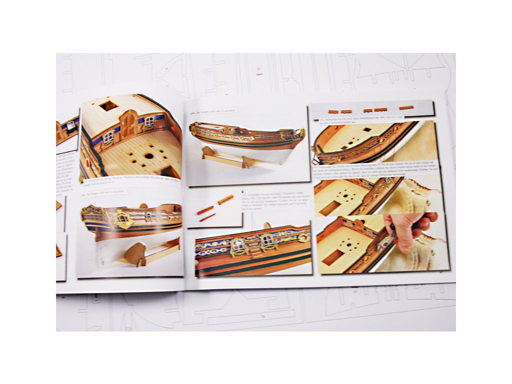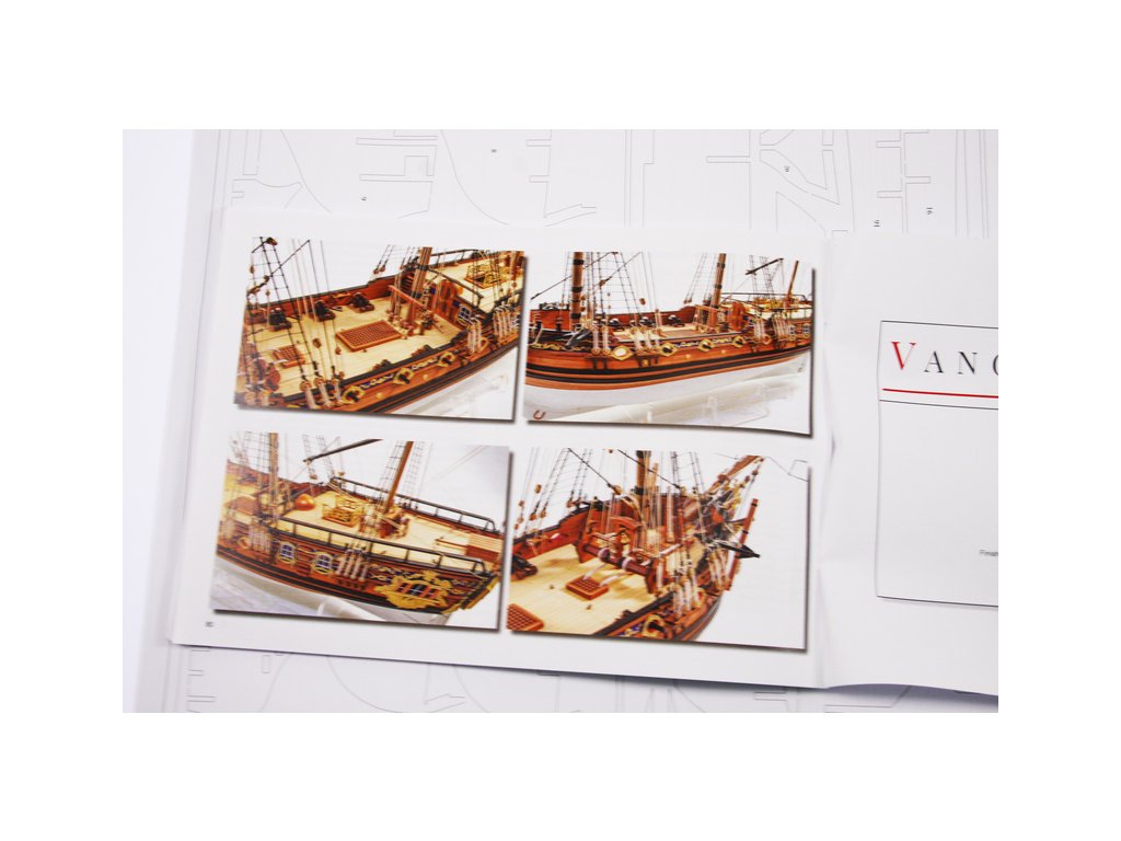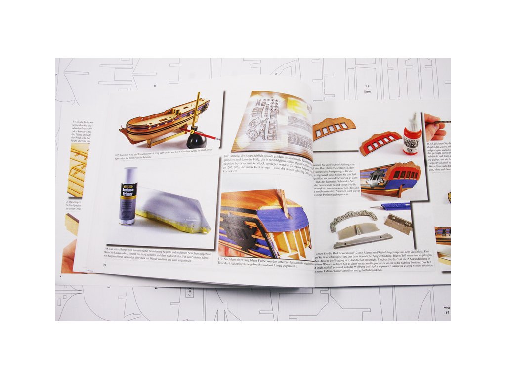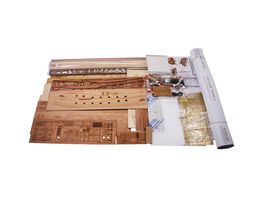 Balení obsahuje laserem řezané dřevěné díly, plaňky, paluby, stožáry, doplňky z pryskyřice, dekorace, mosazné kování, lanoví. Podrobný obrázkový manuál EN a stavební plány.